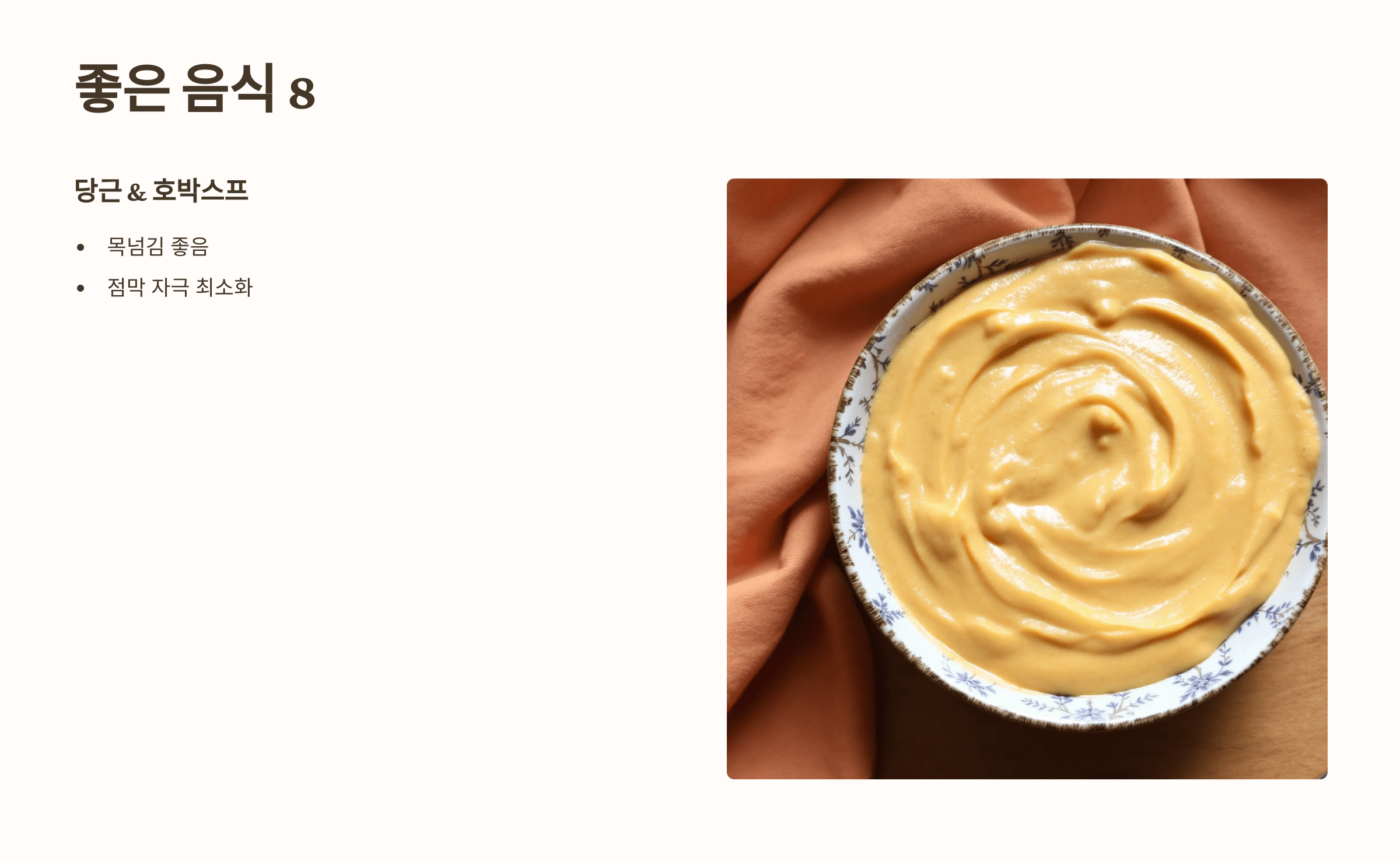 비타민, 미네랄 풍부하고 위 점막을 부드럽게 보호하는 식감입니다. 기름 없이 찐 후 갈아서 섭취하면 좋습니다.