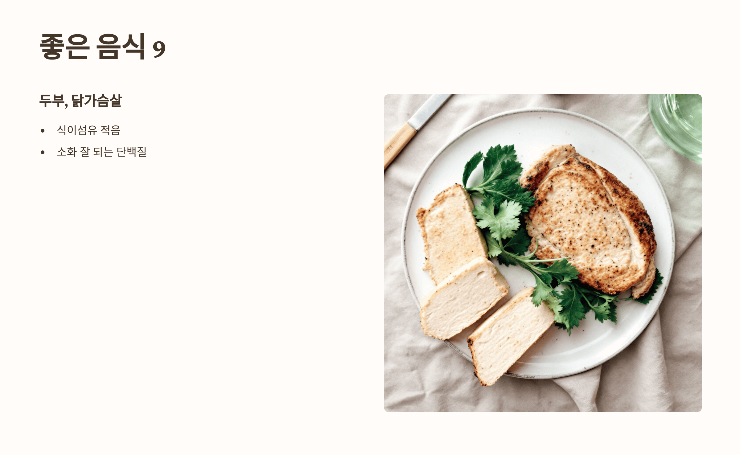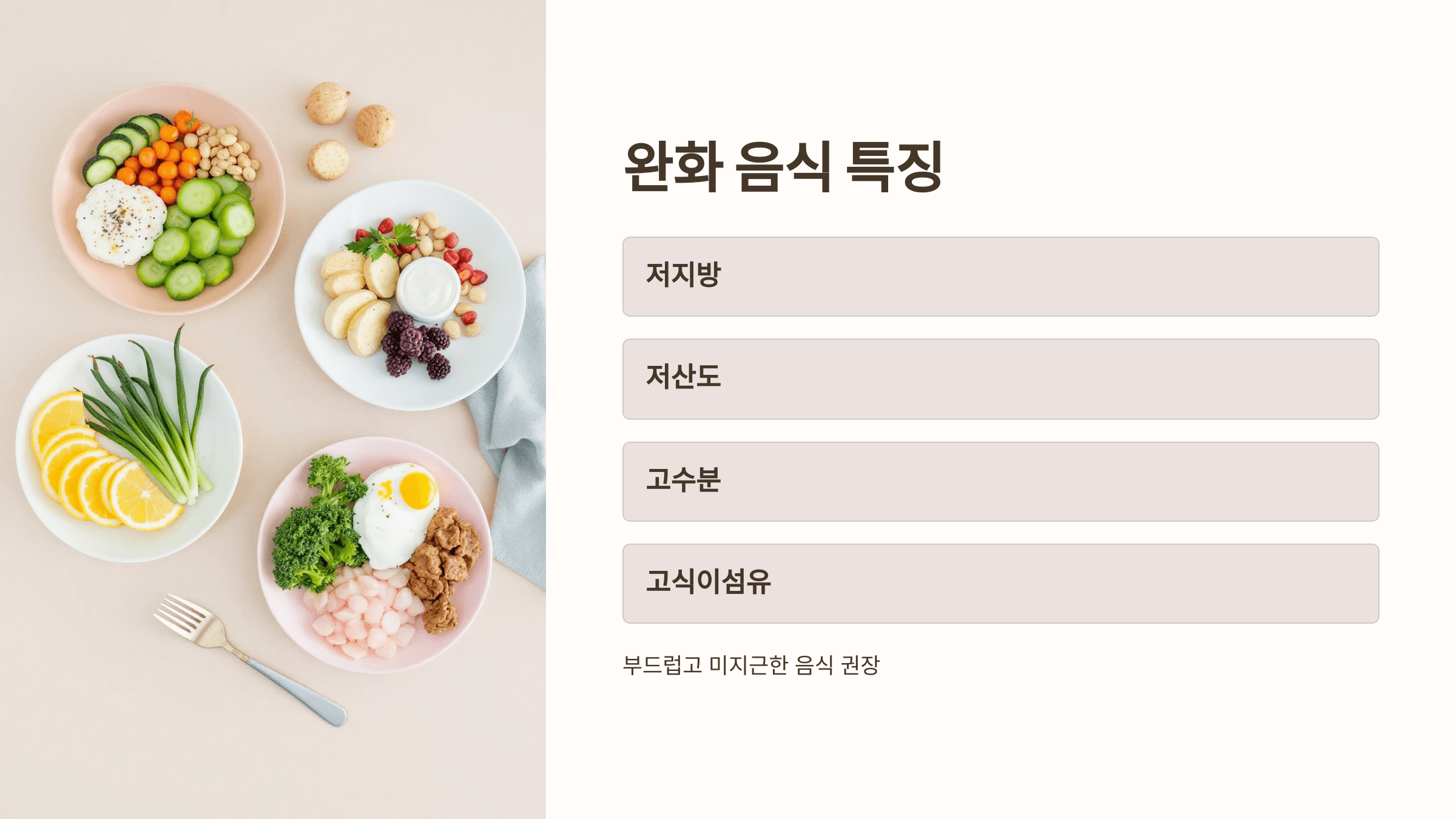 진한 향신료나 기름, 초산이 많은 재료는 피하고 부드럽고 온도는 미지근하게 유지하는 것이 좋아요.
