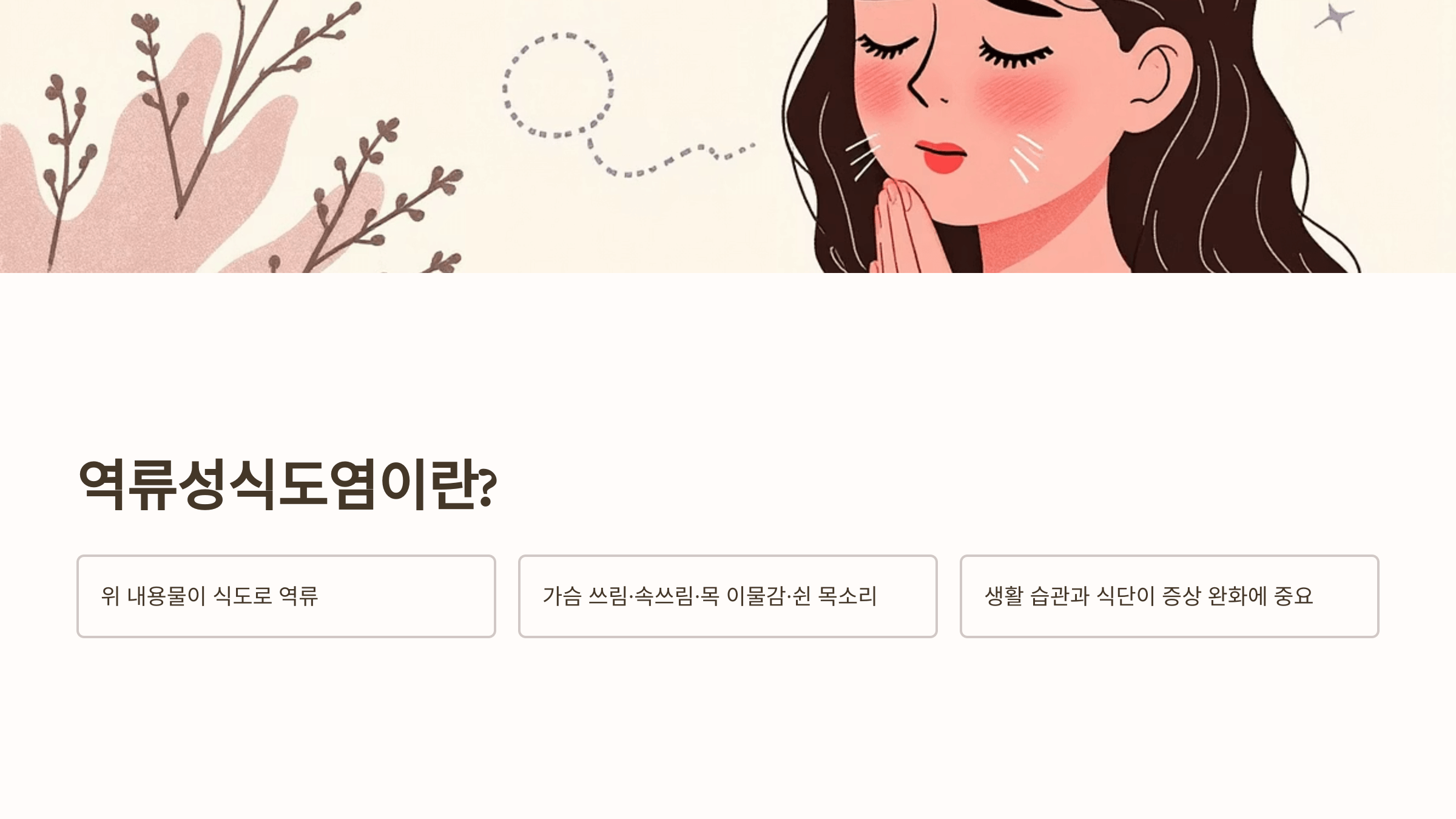 역류성식도염은 위 속 내용물이 식도로 역류해 가슴 쓰림·속쓰림·목 이물감·쉰 목소리 등을 유발하는 질환입니다.
