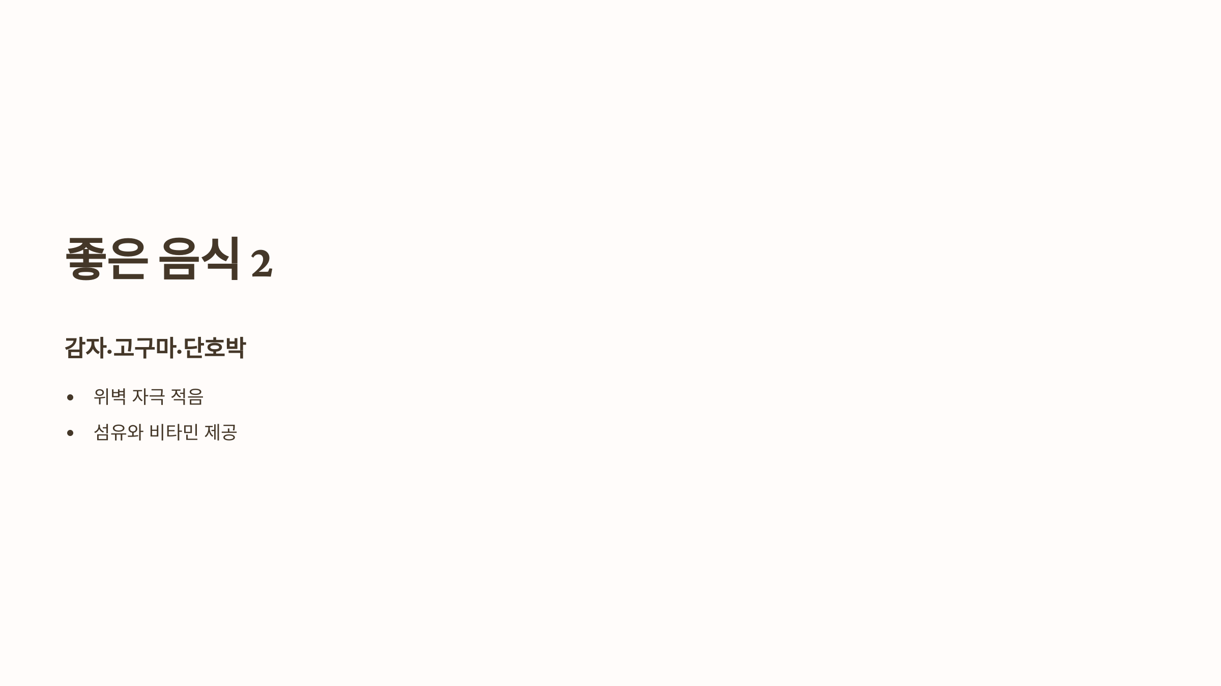 위장 보호 효과가 탁월하며, 수분과 식이섬유가 많아 장운동을 도와줍니다. 볶거나 구운 방식보다 삶거나 찌는 게 좋아요.