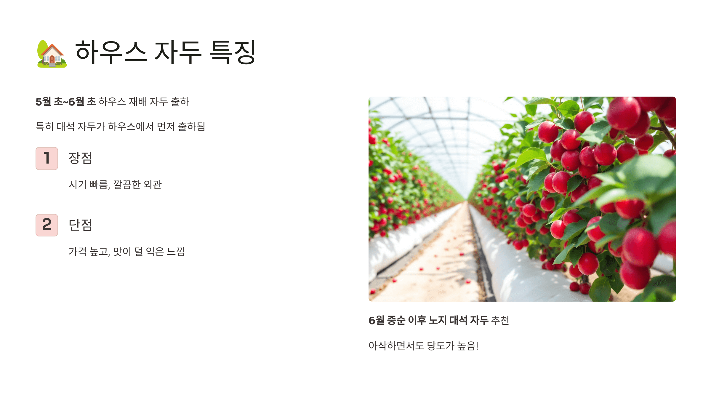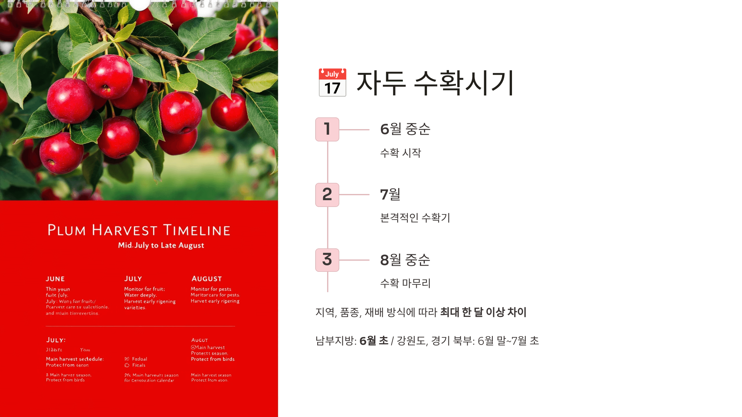 - 남부 지역: 6월 초부터 대석 자두 시작