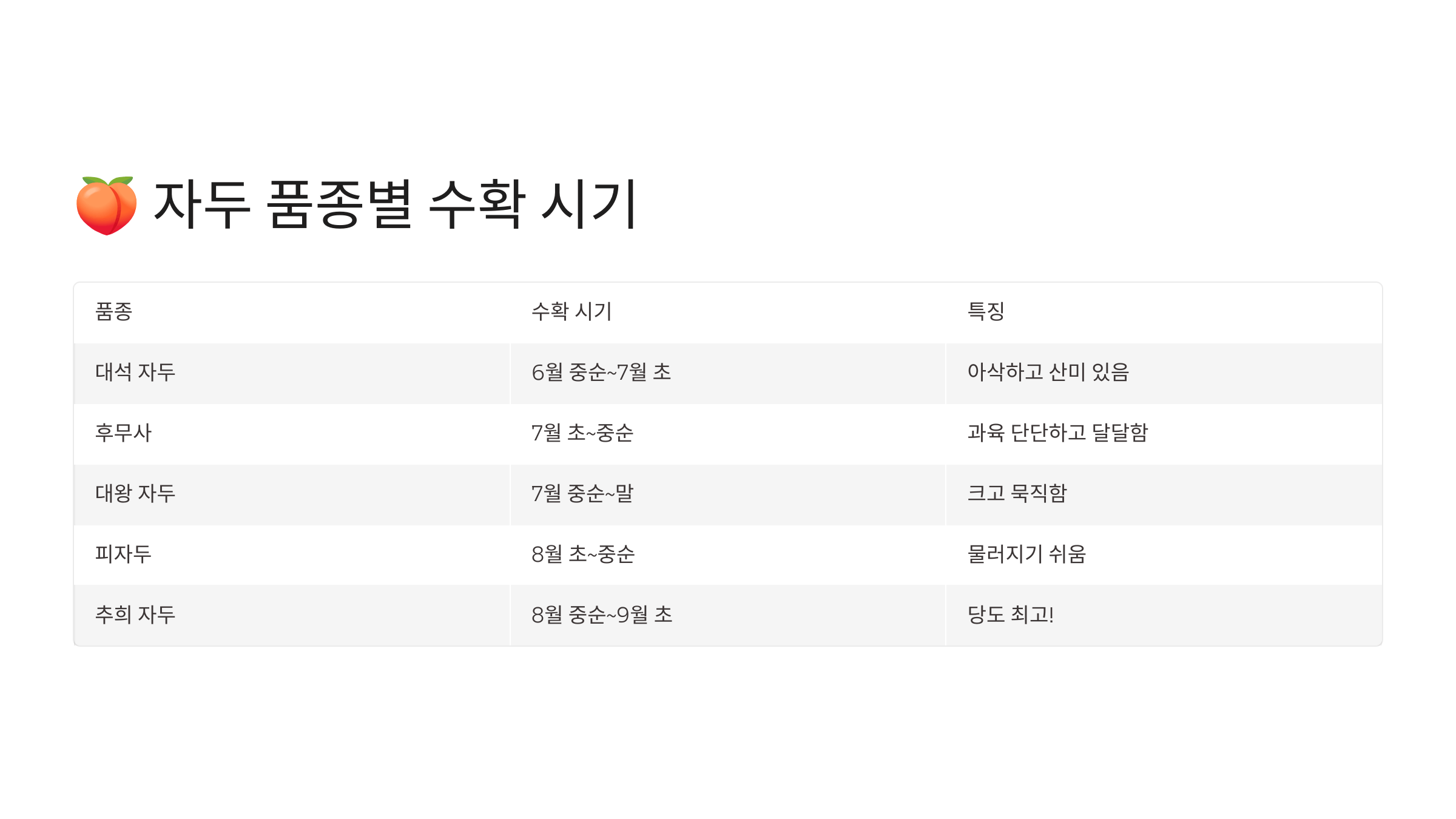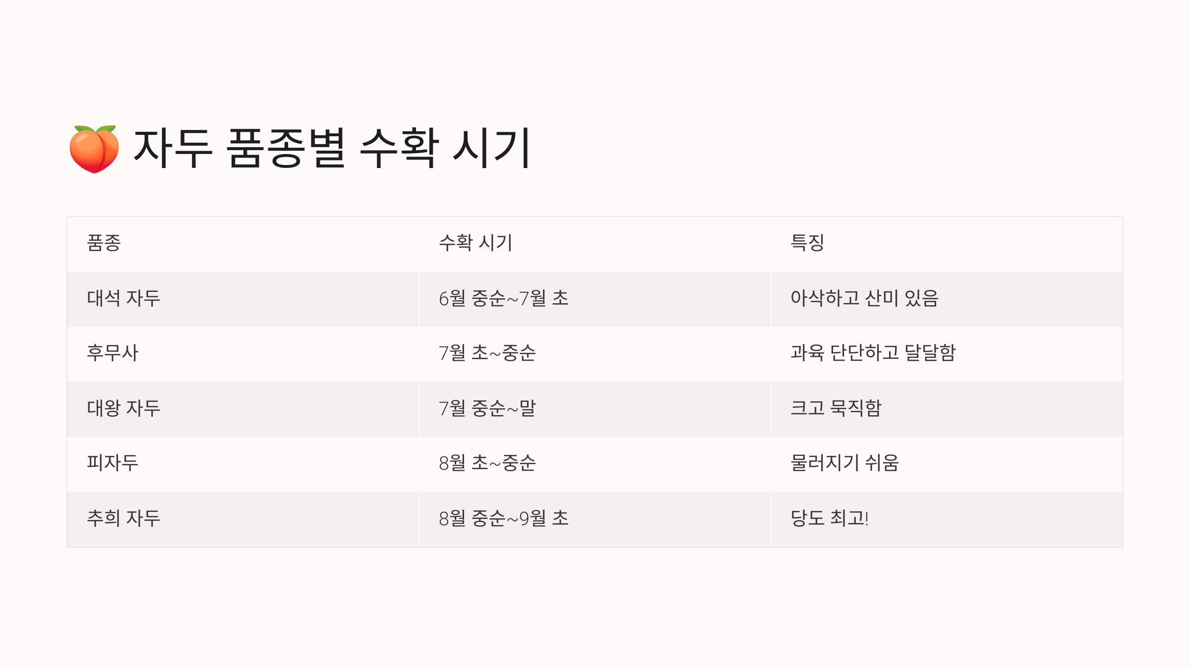| 피자두 | 8월 초~중순 | 물러지기 쉬워 가공용, 잼·청 만들기에 좋아요 |