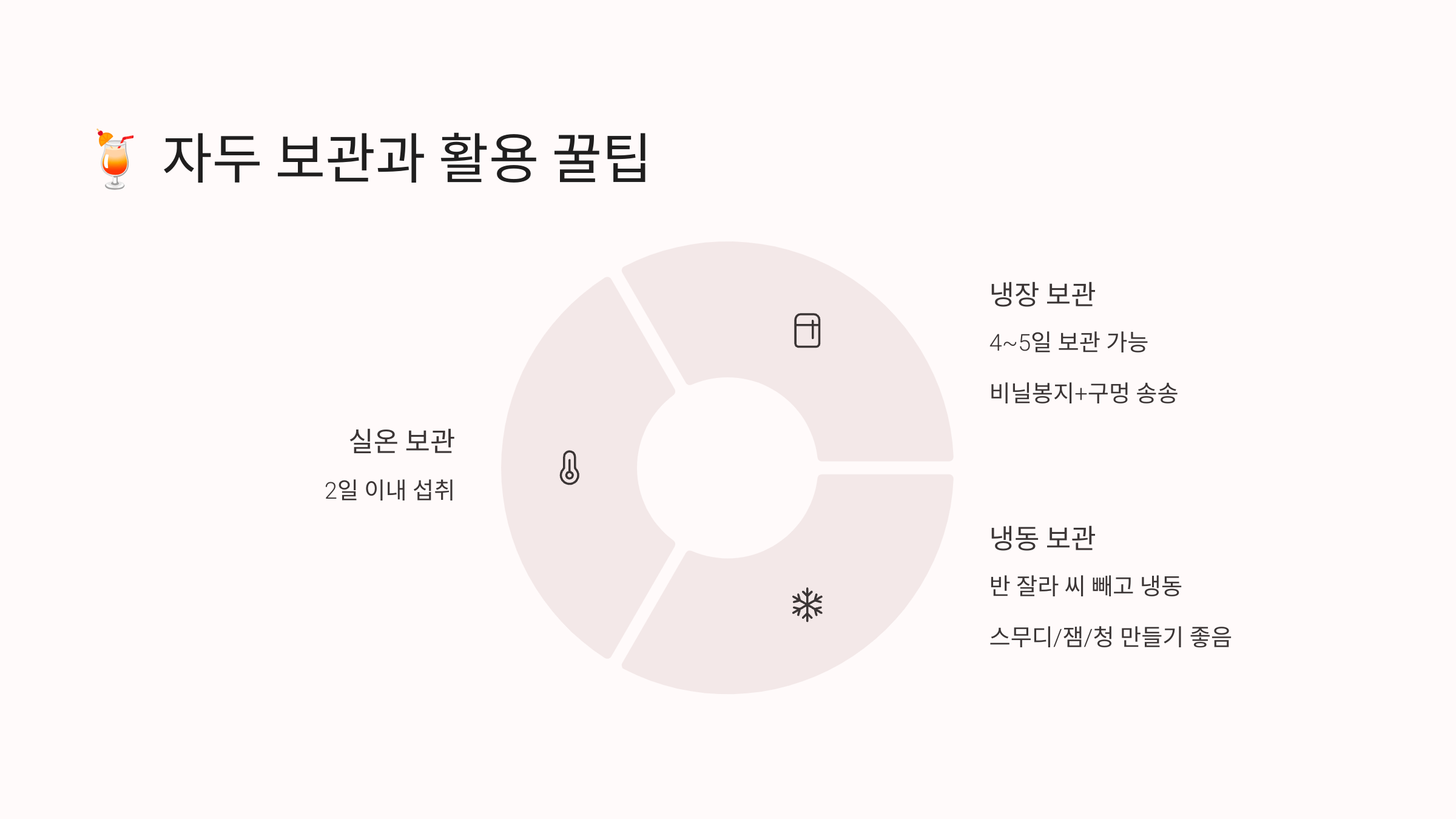 - 냉동: 반 잘라 씨 빼고 냉동 보관 → 스무디/잼/청 만들기 굿!