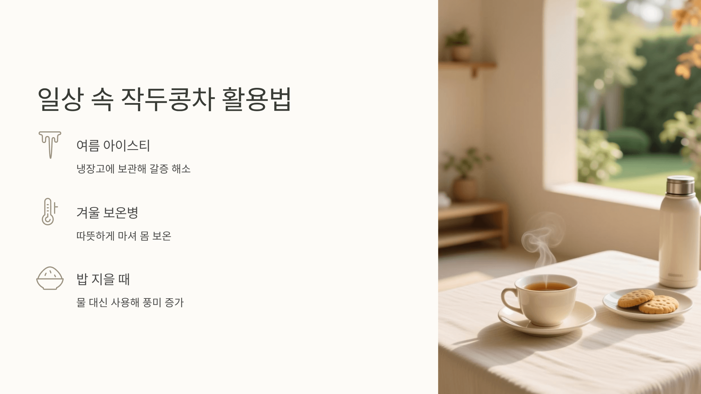 작두콩차는 따뜻하게, 차갑게 모두 즐길 수 있어 계절에 상관없이 유용합니다. 여름에는 냉장고에 보관해 아이스티처럼 마시면 갈증 해소와 동시에 건강까지 챙길 수 있어요. 겨울에는 보온병에 넣어 두고 따뜻하게 마시면 속이 편안해지고 몸이 따뜻해지는 효과를 볼 수 있습니다. 저는 또 밥 지을 때 물 대신 작두콩차를 사용해 보았는데, 은은한 향이 밥에 배어 훨씬 풍미가 좋았습니다. 이렇게 일상에 자연스럽게 녹여내면 꾸준히 마시기에도 부담이 없어요.