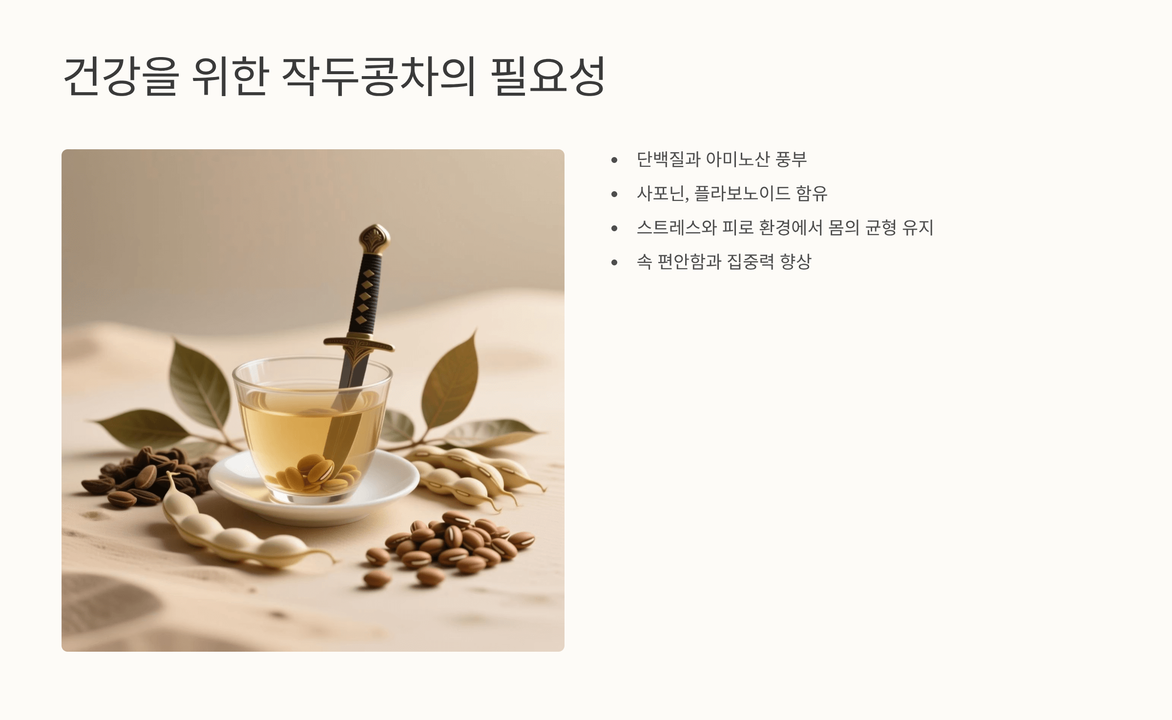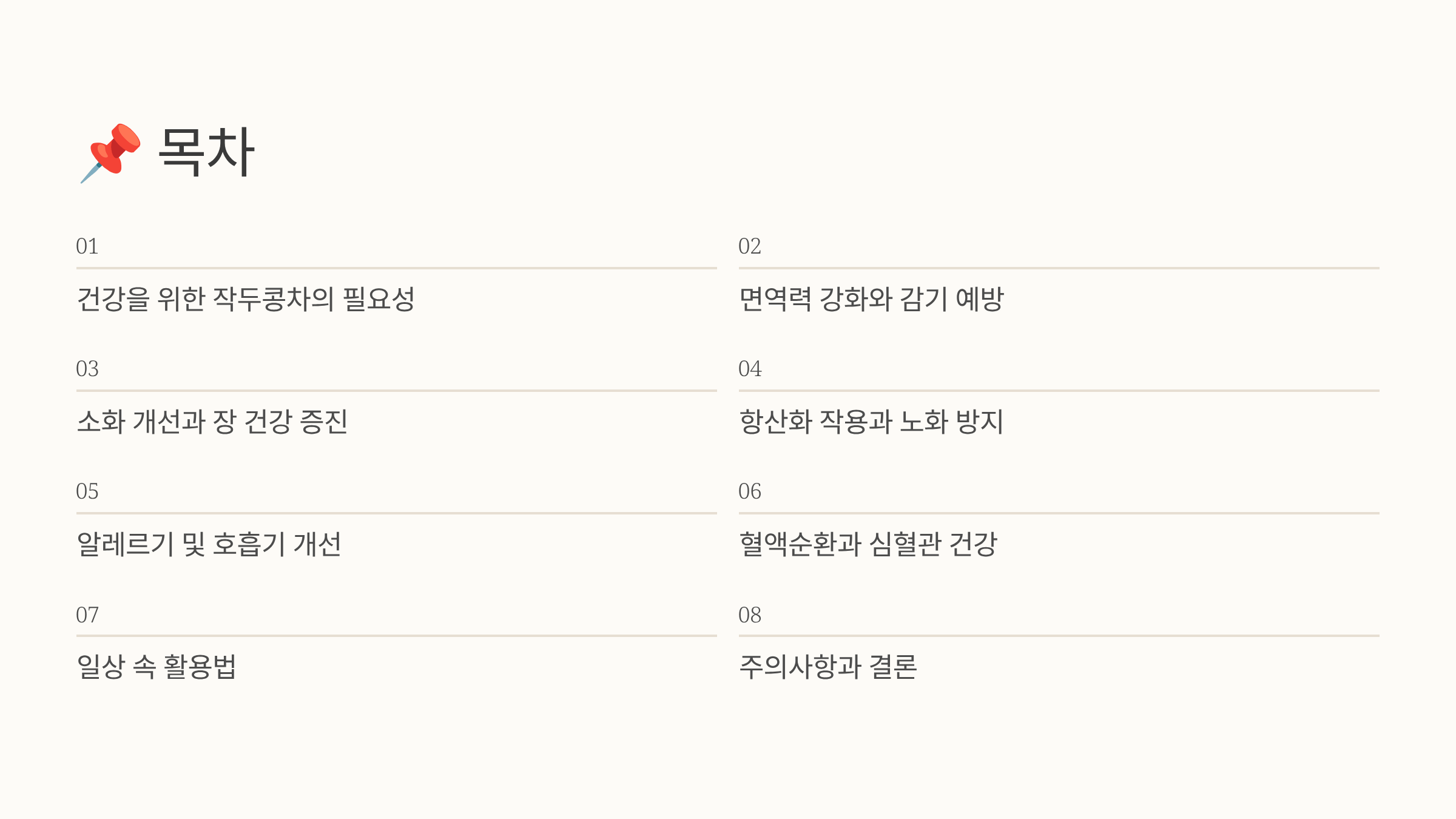 마지막으로 말씀드리자면, 저에게 작두콩차는 단순한 차가 아니라 몸을 편안하게 해주는 작은 습관이 되었어요. 여러분들도 오늘부터 한 잔씩 시작해 보시길 추천드립니다. 다음에는 또 다른 건강차 이야기를 준비해올께요!
