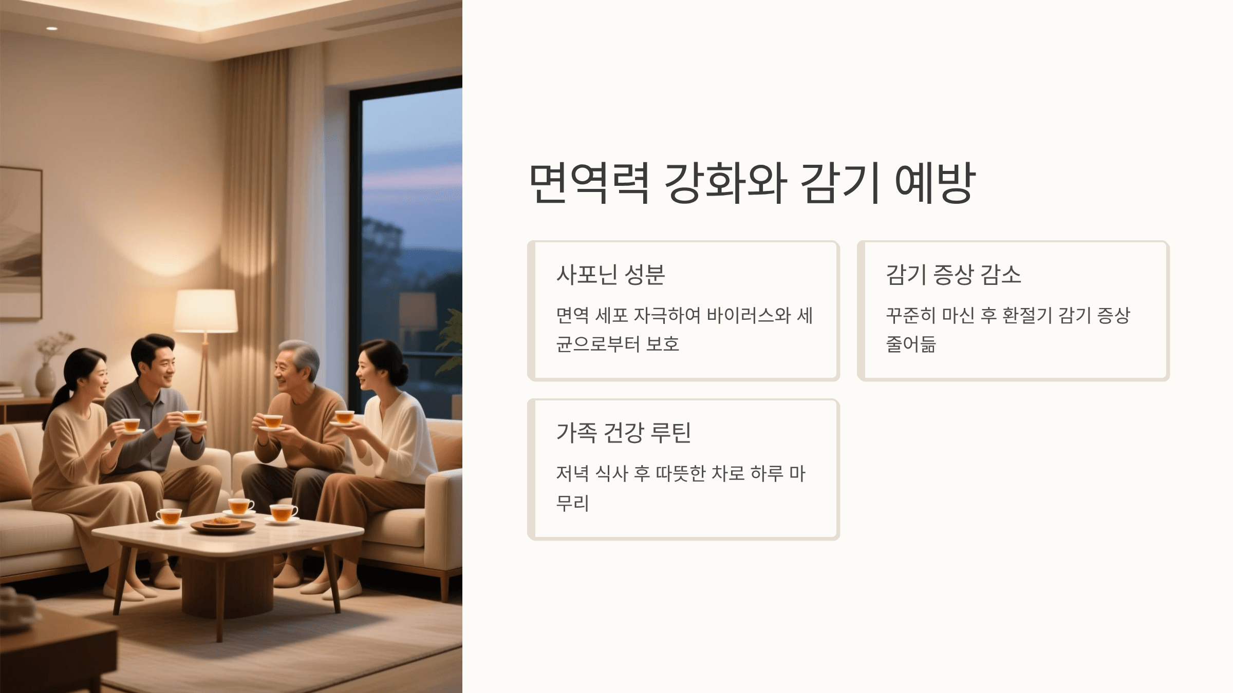 작두콩차에는 면역력을 강화하는 성분이 다수 포함되어 있습니다. 특히 사포닌은 면역 세포를 자극하여 바이러스와 세균으로부터 몸을 보호하는 역할을 해줍니다. 환절기마다 감기에 자주 걸리던 제가 작두콩차를 꾸준히 마신 후로는 확실히 감기 증상이 줄었고, 몸이 한결 가볍게 느껴졌습니다. 가족들과 함께 저녁 식사 후 따뜻하게 우려낸 차를 마시며 하루를 마무리하는 습관을 들였더니 건강뿐 아니라 마음도 편안해지더라구요.