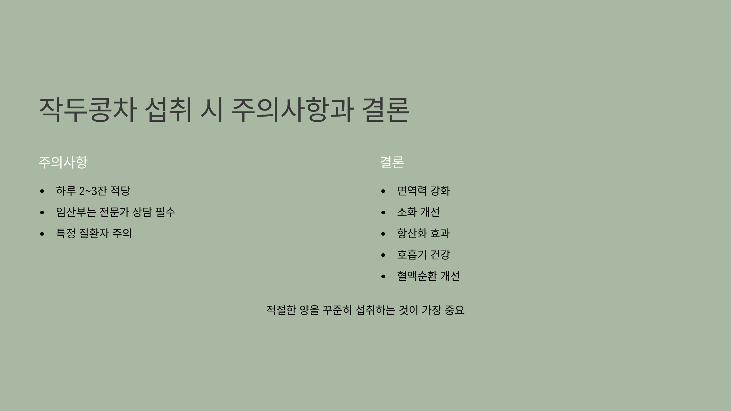 아무리 좋은 효능을 가진 차라도 과유불급이라는 말이 맞습니다. 하루 2~3잔 정도가 적당하며, 특히 임산부나 특정 질환을 가진 분들은 반드시 전문가 상담 후 섭취해야 합니다. 결론적으로 작두콩차는 면역력 강화, 소화 개선, 항산화 효과, 호흡기 건강, 혈액순환 개선까지 다양한 장점을 갖춘 차이지만, 적절한 양을 꾸준히 섭취하는 것이 가장 중요합니다. 저도 이 점을 지키며 즐기다 보니 몸과 마음이 동시에 건강해졌습니다.