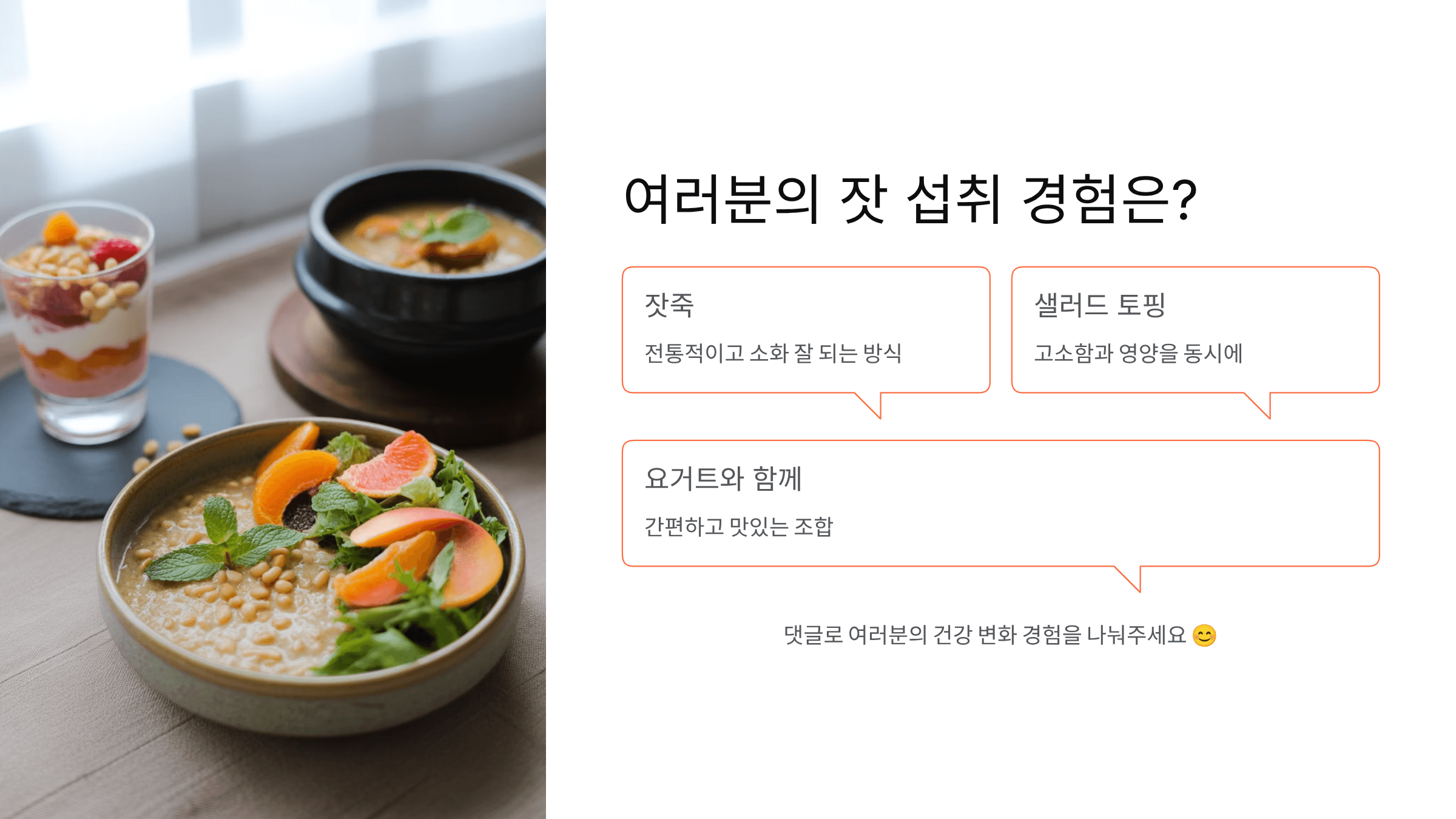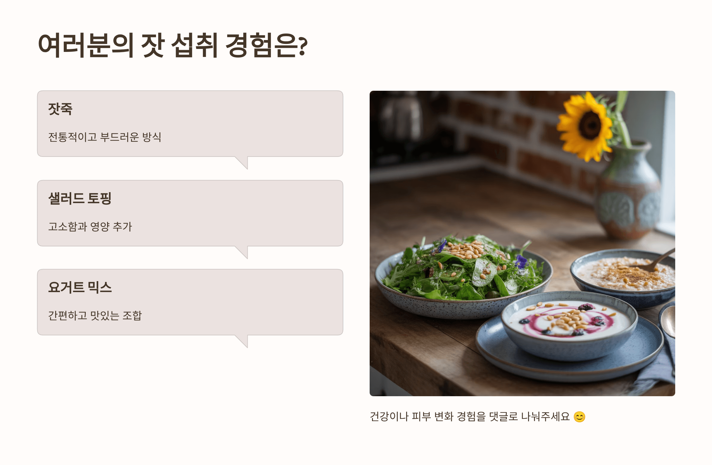 여러분은 잣을 어떤 방식으로 즐겨 드시나요? 저는 주로 잣죽을 즐기지만, 샐러드 위에 뿌려 먹거나 요거트와 함께 먹는 것도 참 좋아해요. 혹시 잣을 꾸준히 드시면서 건강이나 피부에서 변화를 경험해 보신 적 있으신가요? 댓글로 함께 나눠주시면 좋겠습니다 😊.