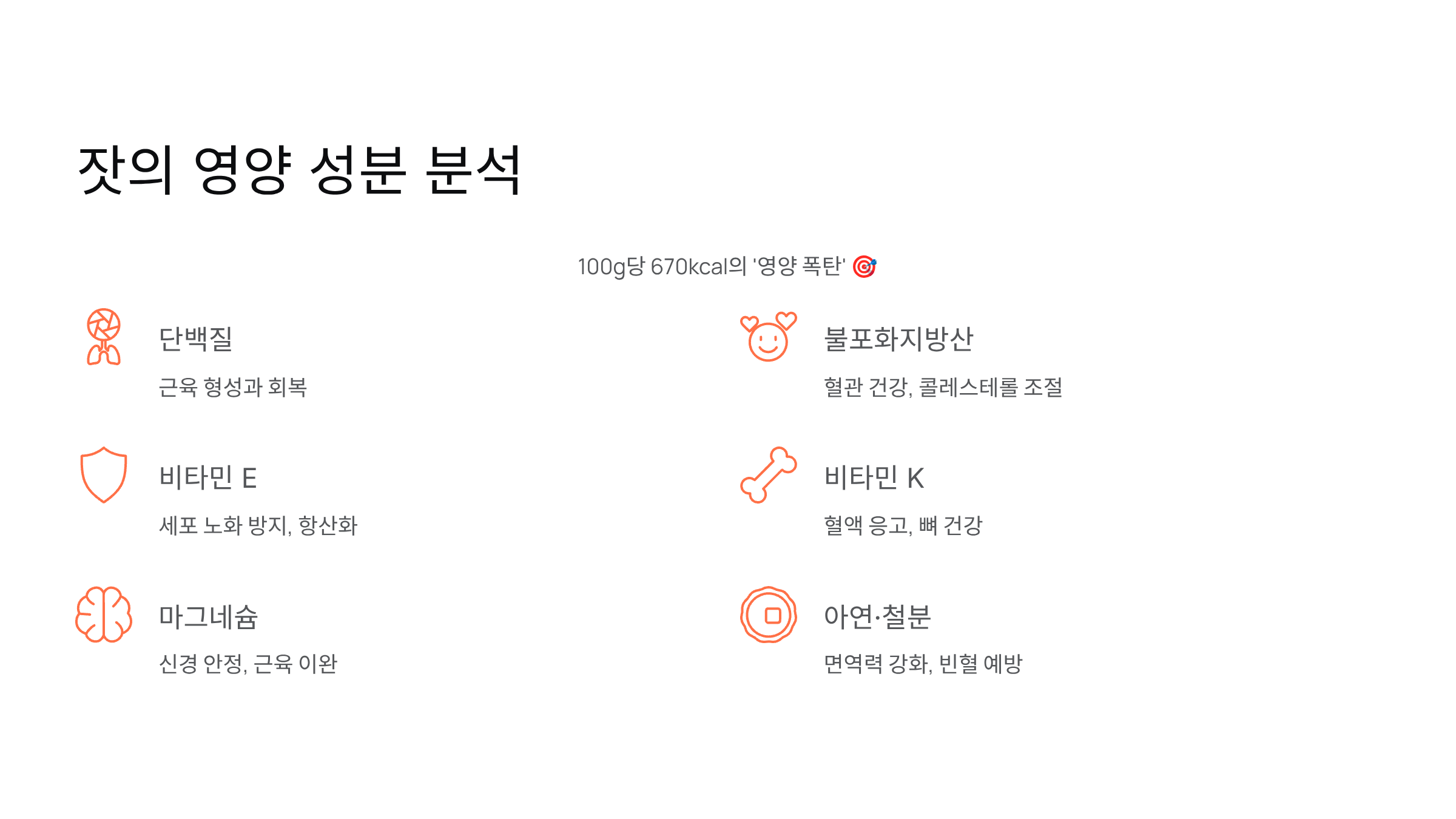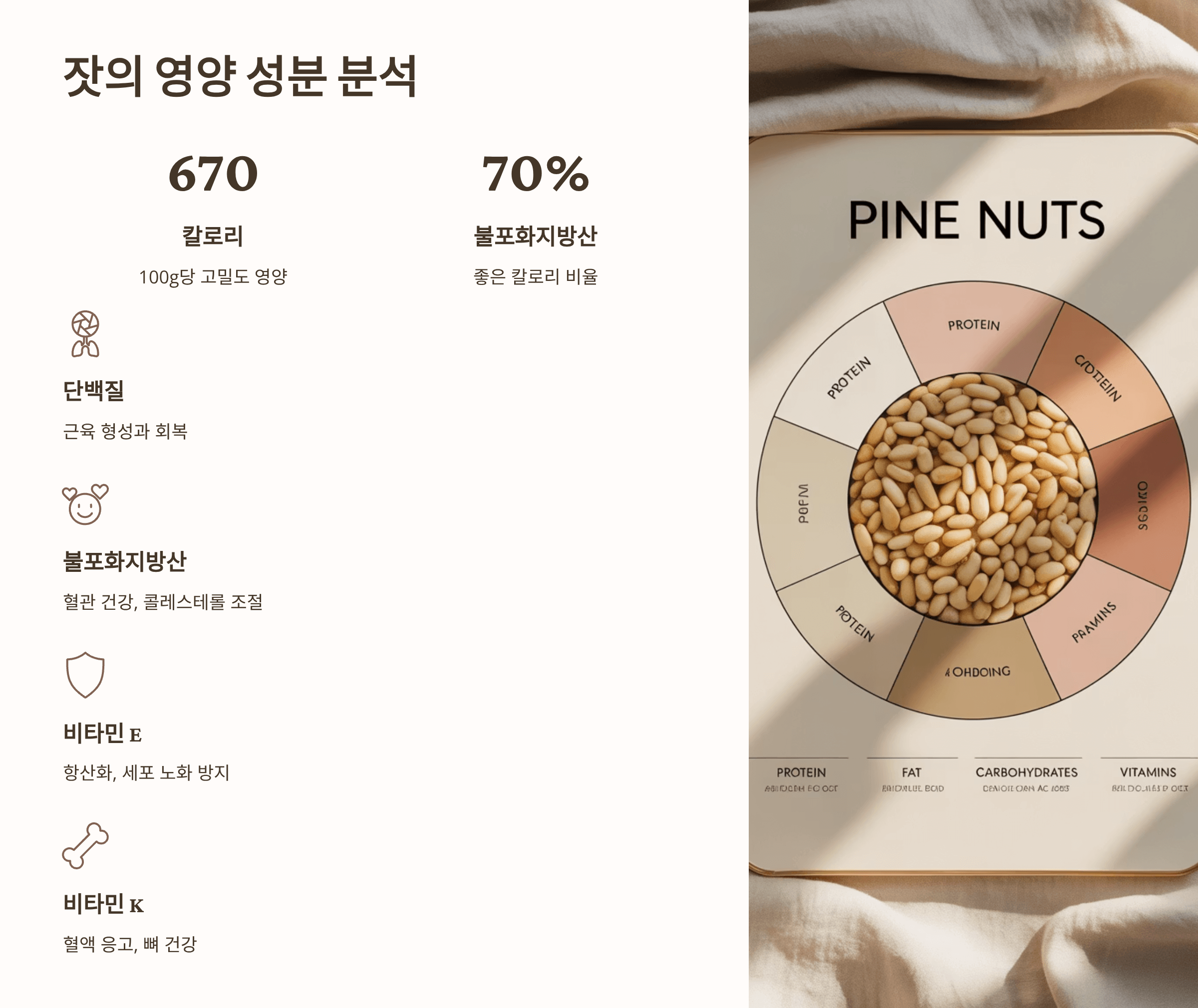 잣은 겉보기에는 작지만 ‘영양 폭탄’이라고 불릴 만큼 다양한 성분을 담고 있습니다. 100g당 약 670kcal의 높은 열량을 지니지만, 대부분이 불포화지방산에서 비롯된 ‘좋은 칼로리’입니다. 주요 영양 성분을 보면: