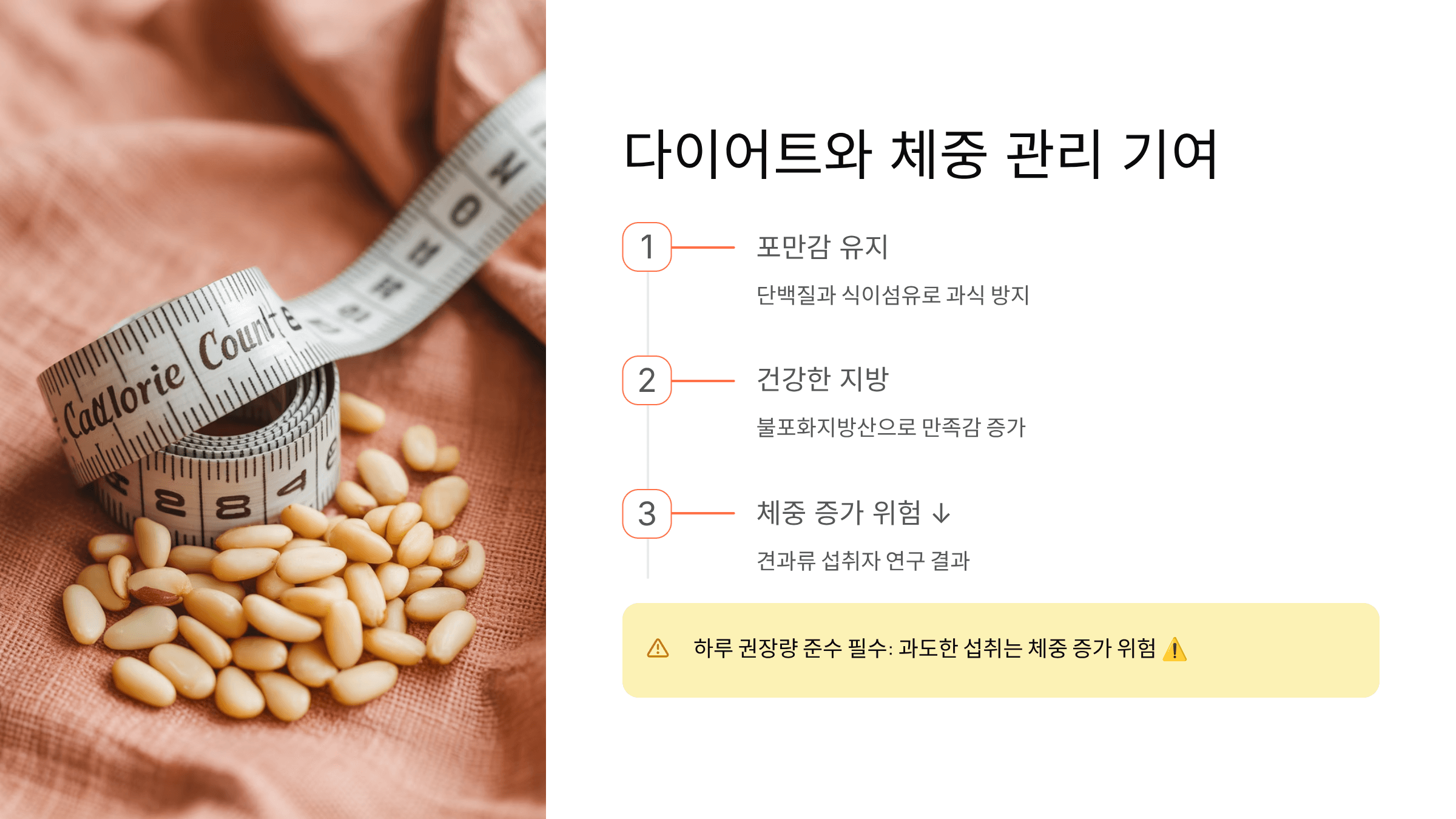 잣은 칼로리가 높은 편이라 다이어트에 부적합하다고 생각하기 쉽지만, 오히려 소량 섭취하면 체중 관리에 큰 도움이 됩니다. 단백질과 식이섬유, 건강한 지방이 포만감을 오래 유지시켜 과식을 방지하기 때문이죠. 실제 연구에서도 견과류를 적절히 섭취하는 사람들은 그렇지 않은 사람보다 체중 증가 위험이 낮다는 결과가 보고된 바 있습니다. 저도 다이어트 중 군것질 욕구가 강할 때 잣을 한 줌 먹으면 배고픔이 덜하고 만족감이 커서 도움이 많이 됐습니다 ✅. 단, 과도하게 먹으면 칼로리 섭취가 많아져 체중 증가로 이어질 수 있으니 하루 권장량을 꼭 지켜야 합니다.