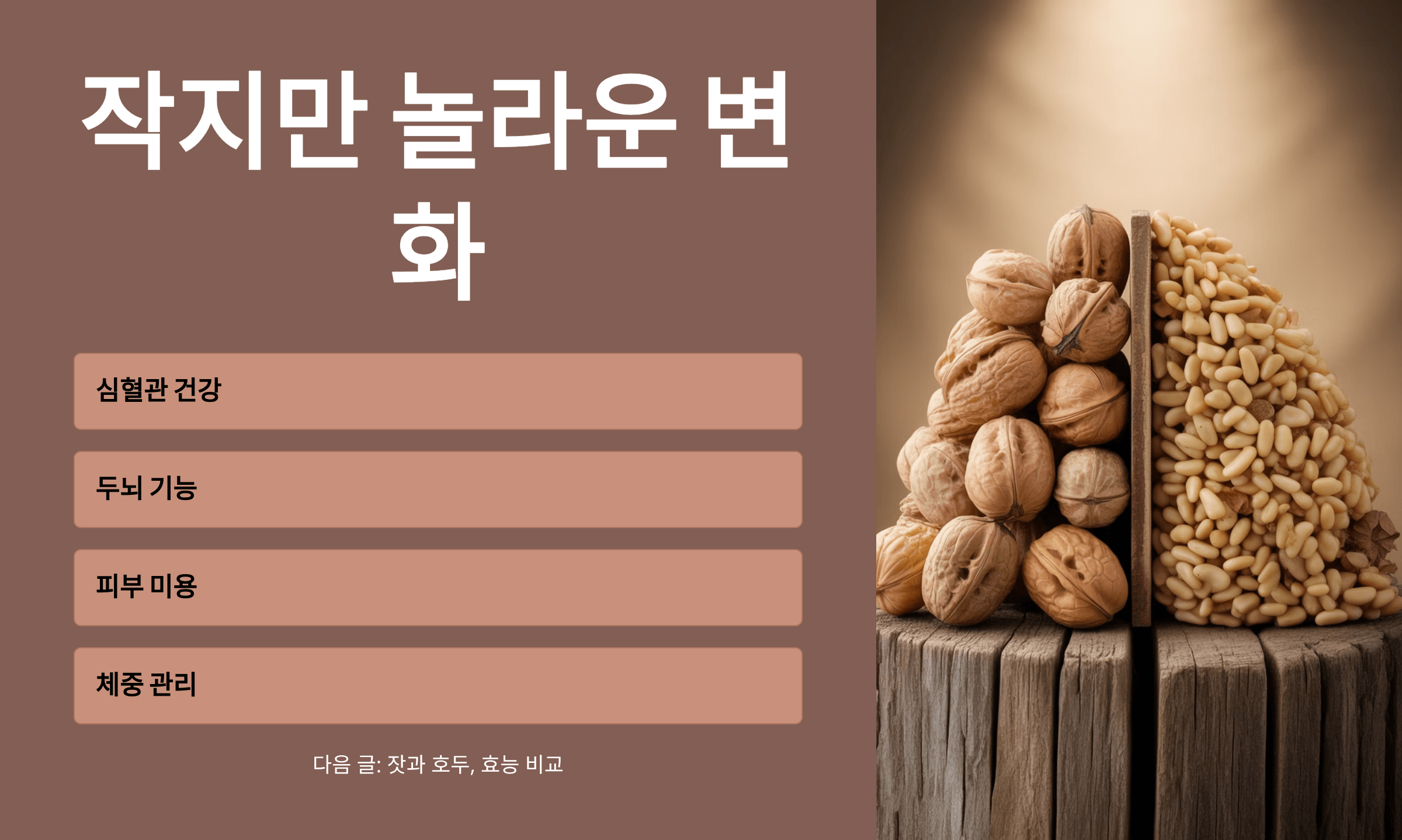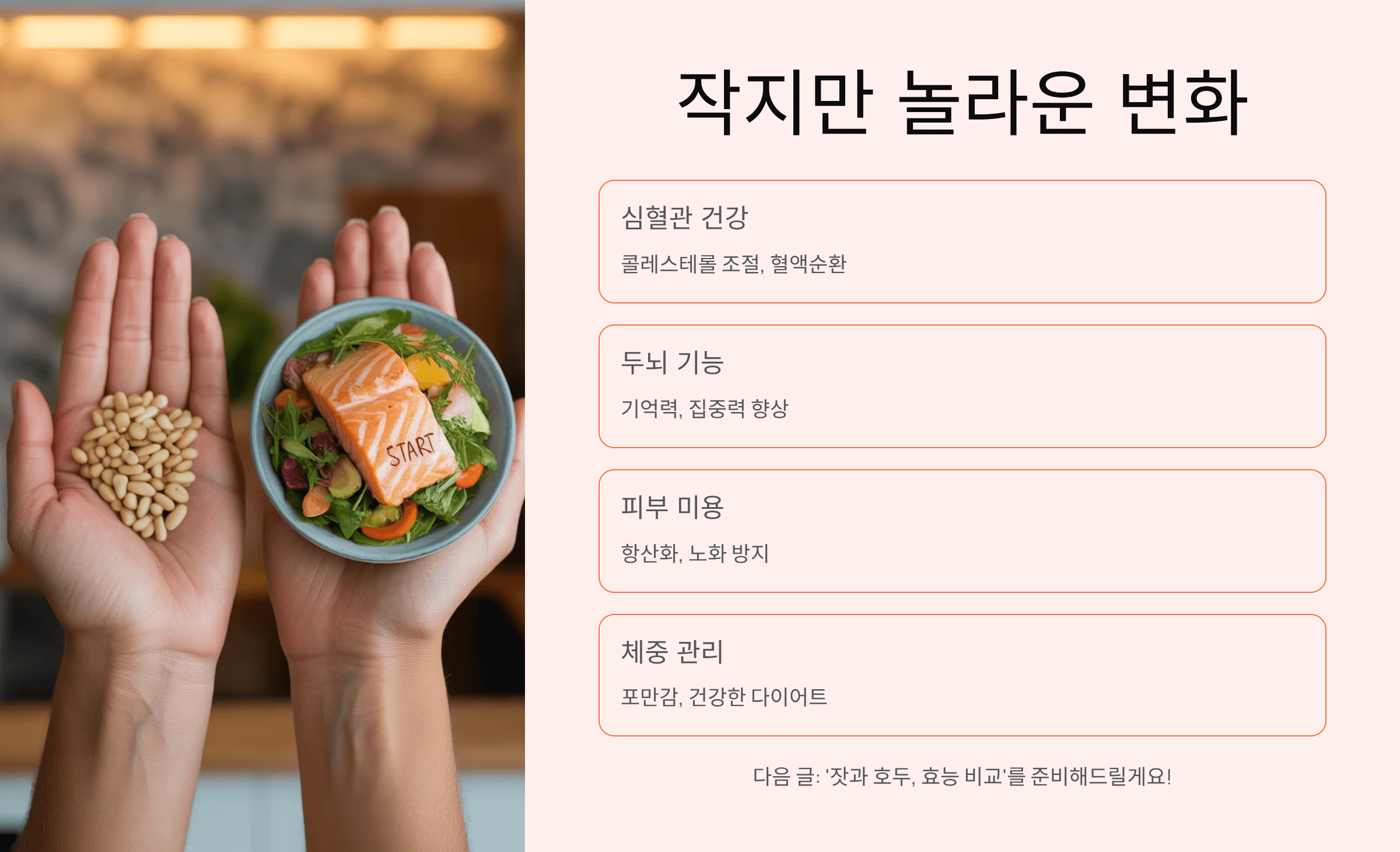 짧게 정리하자면, 잣은 작지만 우리 몸에 놀라운 변화를 가져다주는 슈퍼푸드입니다. 심혈관 건강, 두뇌 기능, 피부 미용, 체중 관리까지 고루 도움을 줄 수 있죠. 저도 잣을 꾸준히 챙겨 먹으며 얻은 건강상의 변화를 몸소 느끼고 있어서 자신 있게 추천드립니다. 다음 글에서는 ‘잣과 호두, 효능 비교’를 준비해드릴게요!