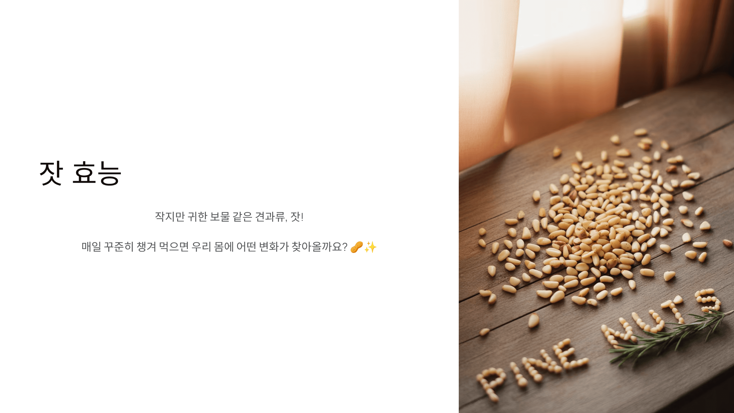 작지만 귀한 보물 같은 견과류, 잣! 매일 꾸준히 챙겨 먹으면 우리 몸에 어떤 변화가 찾아오는지 알려드릴게요 🥜✨