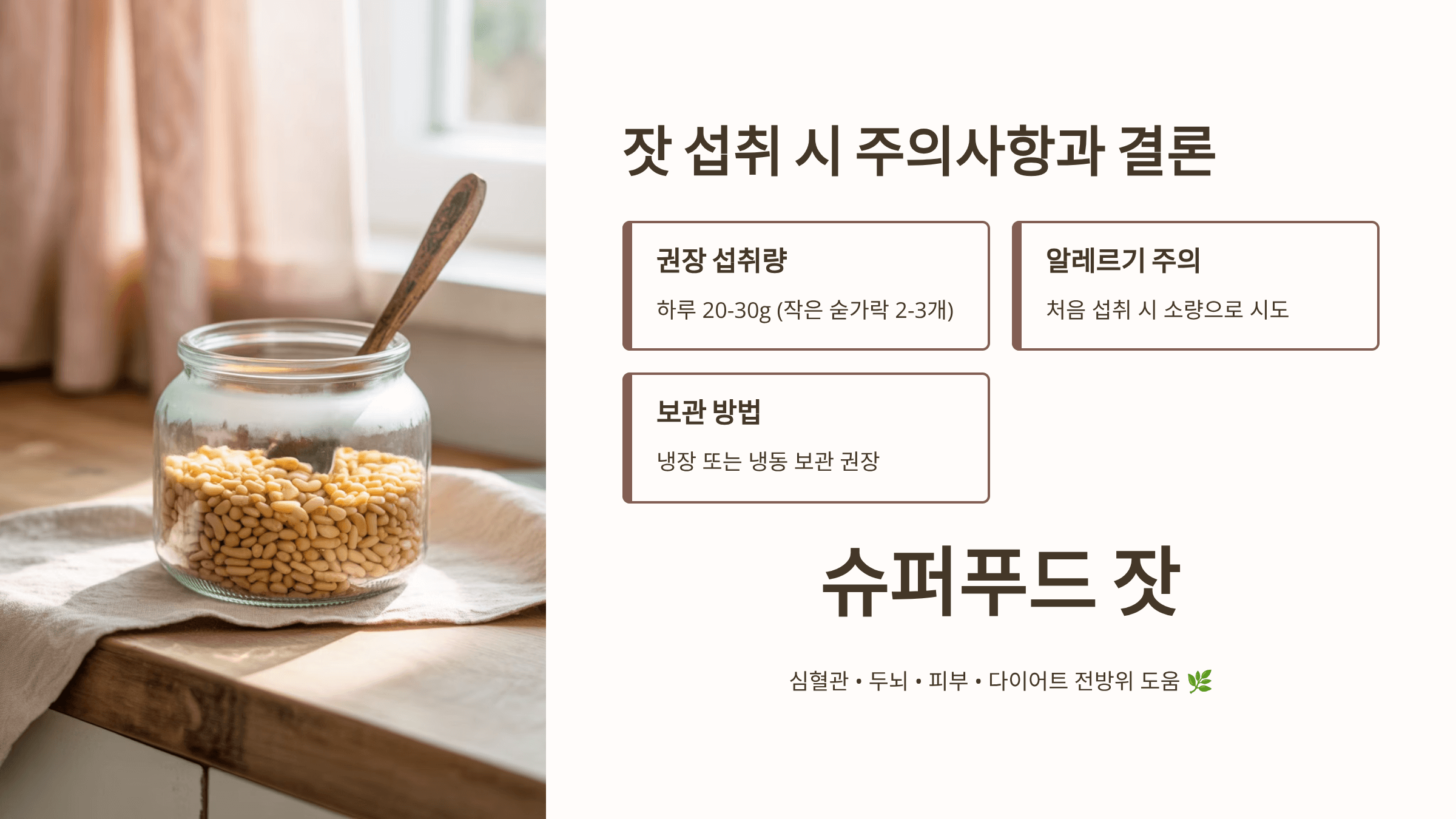결론적으로 잣은 심혈관 건강, 두뇌 기능, 피부 미용, 다이어트까지 전방위적으로 도움을 주는 슈퍼푸드입니다. 단, 적정량을 지키고 올바른 방법으로 보관해야 진정한 효능을 누릴 수 있습니다. 저도 잣을 꾸준히 챙겨 먹으면서 체력이 회복되고 피부가 좋아지는 변화를 체감하고 있어, 여러분께 자신 있게 추천드릴 수 있습니다 🌿.