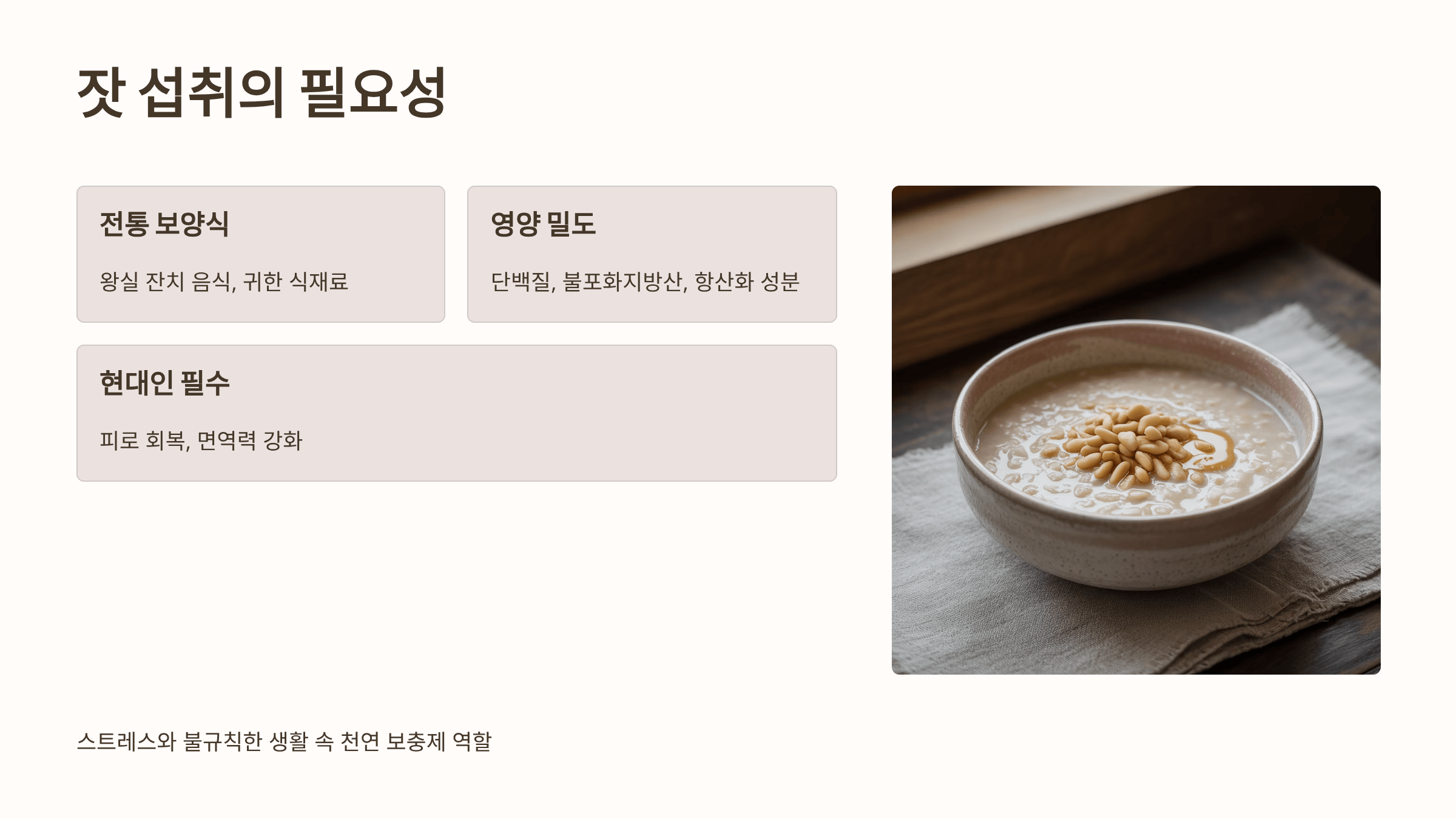 잣은 예로부터 귀한 식재료로 여겨져 왕실이나 잔치 음식에 자주 사용되던 견과류입니다. 특히 한국에서는 잣죽, 잣소스, 잣화채 등 전통 요리에 빠지지 않고 등장했지요. 그만큼 잣은 단순한 간식이 아니라 보양식이자 건강식으로 사랑받아왔습니다. 잣에는 단백질, 불포화지방산, 항산화 성분, 비타민, 미네랄이 풍부하게 들어 있어 피로 회복과 면역력 강화에 효과적입니다. 실제로 제가 지쳐 있을 때 잣죽을 먹으면 속이 편안해지고 몸에 기운이 도는 걸 자주 느꼈습니다. 현대인들은 스트레스와 불규칙한 생활습관 때문에 쉽게 피로해지는데, 잣은 이러한 생활 패턴 속에서 균형을 잡아주는 훌륭한 천연 보충제 역할을 합니다.