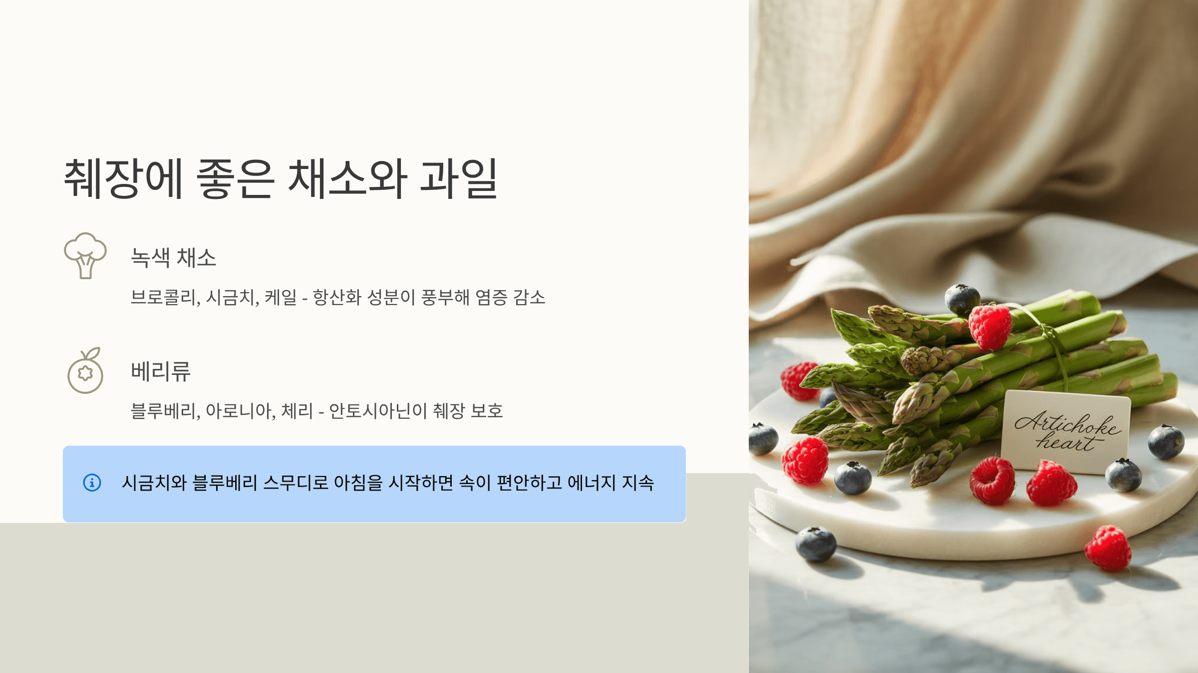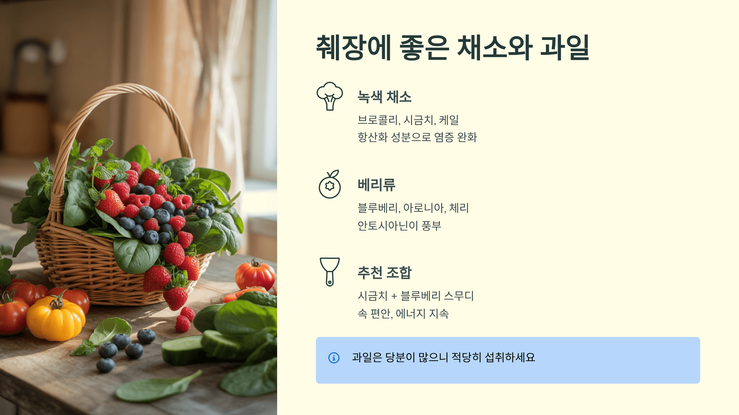 췌장 건강을 지키기 위해서는 신선한 채소와 과일을 충분히 섭취하는 것이 중요합니다. 🥕 특히 브로콜리, 시금치, 케일 같은 녹색 채소는 항산화 성분이 풍부해 염증을 줄여주고 췌장을 보호합니다. 과일 중에서는 블루베리, 아로니아, 체리처럼 안토시아닌이 많은 열매류가 췌장에 좋습니다. 저는 아침마다 시금치와 블루베리를 함께 넣은 스무디를 즐기는데, 속이 편안하고 에너지가 오래 유지되는 걸 느꼈어요. 단, 과일은 당분이 많을 수 있으니 과도한 섭취보다는 적당히 드시는 게 좋습니다.