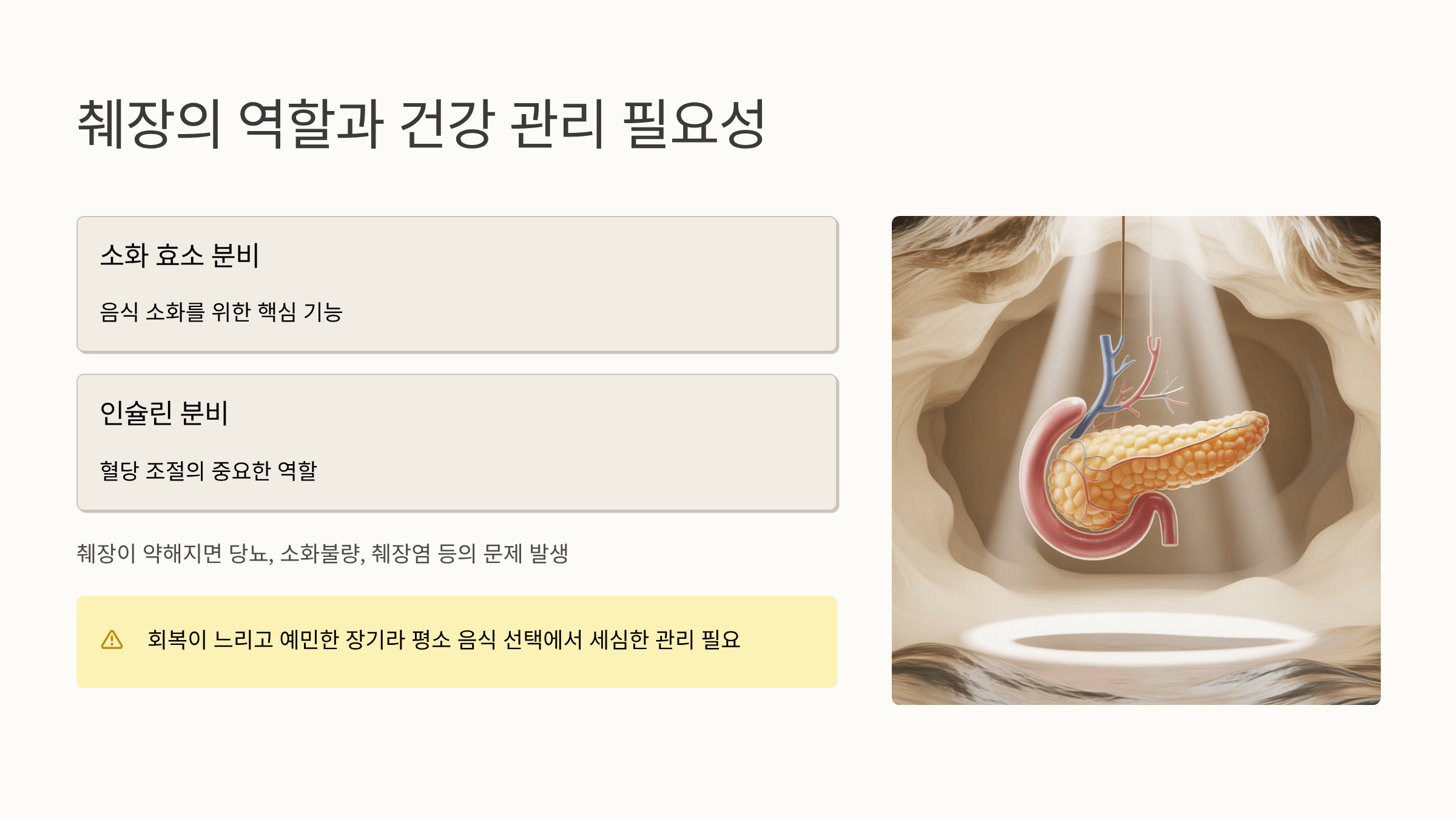 췌장은 우리 몸에서 소화 효소와 인슐린을 분비하는 아주 중요한 장기입니다. 🍽️ 소화 기능뿐 아니라 혈당 조절까지 담당하기 때문에 췌장이 약해지면 당뇨, 소화 불량, 췌장염 같은 문제가 생길 수 있습니다. 저도 가족 중 한 분이 췌장 건강 문제로 고생하신 경험이 있어서, 그 이후로 식습관을 바꾸는 것이 얼마나 중요한지 절실히 느꼈습니다. 췌장은 회복이 느리고 예민한 장기라 평소 음식 선택에서 세심한 관리가 필요합니다. ‘무엇을 먹느냐’가 곧 췌장 건강을 좌우한다는 점을 잊지 말아야 해요.
