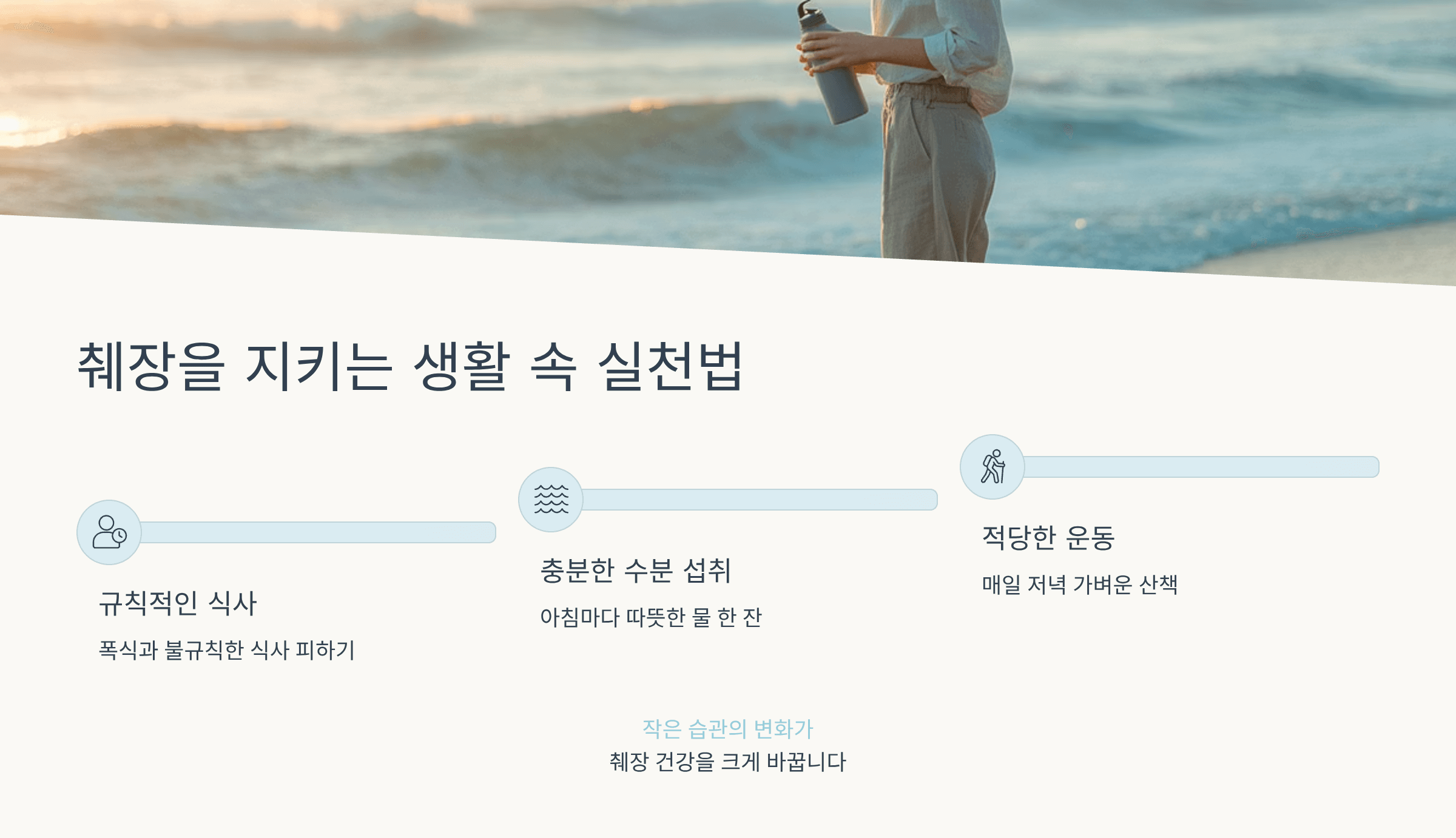 췌장을 건강하게 유지하려면 음식뿐 아니라 생활 습관도 중요합니다. 🧘 규칙적인 식사, 충분한 수분 섭취, 그리고 적당한 운동이 췌장을 지켜줍니다. 저는 매일 저녁 가볍게 산책을 하고, 아침마다 따뜻한 물 한 잔으로 하루를 시작하는 습관을 들였는데, 속이 편안해지고 몸이 한결 가벼워졌습니다. 또한 폭식이나 불규칙한 식사는 췌장에 큰 부담을 주므로 가능한 한 피해야 합니다. 작은 습관의 변화가 췌장 건강을 크게 바꿀 수 있다는 걸 꼭 기억하시길 바랍니다.