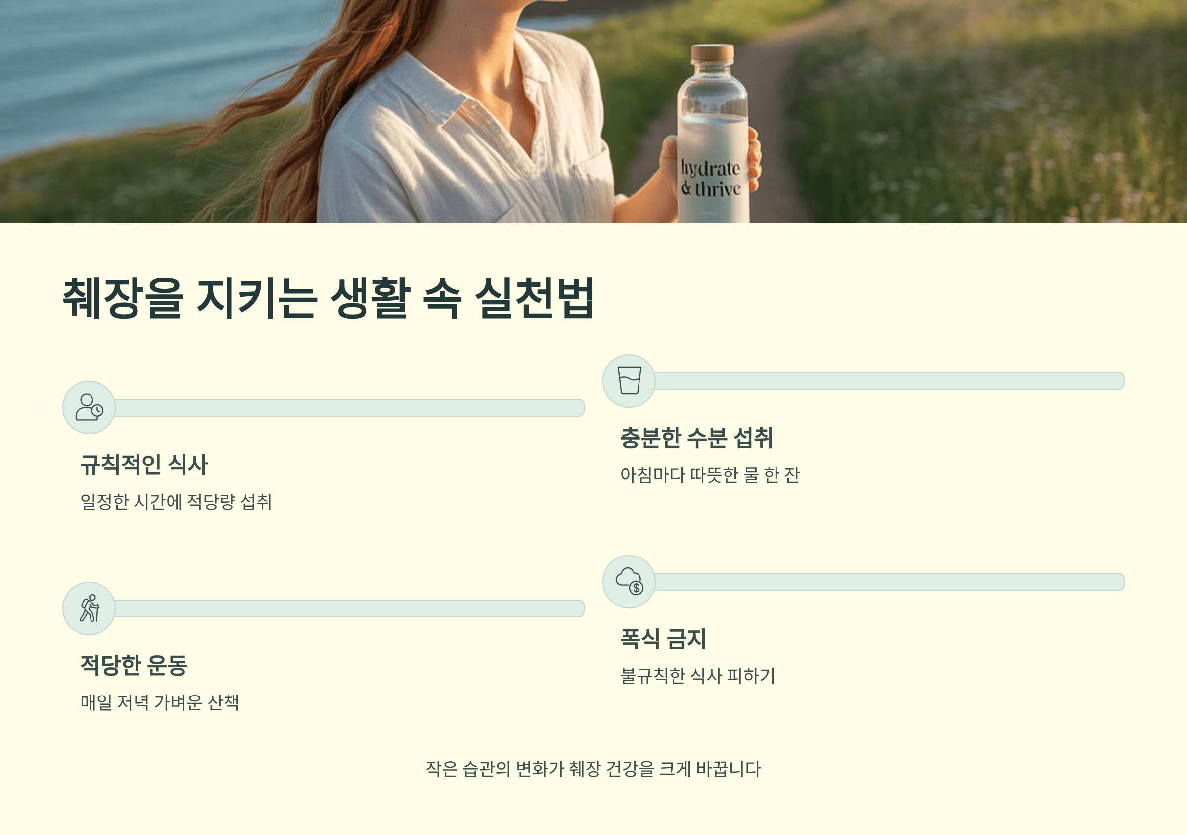 규칙적인 식사, 충분한 수분 섭취, 폭식 금지, 적절한 운동이 필수입니다.