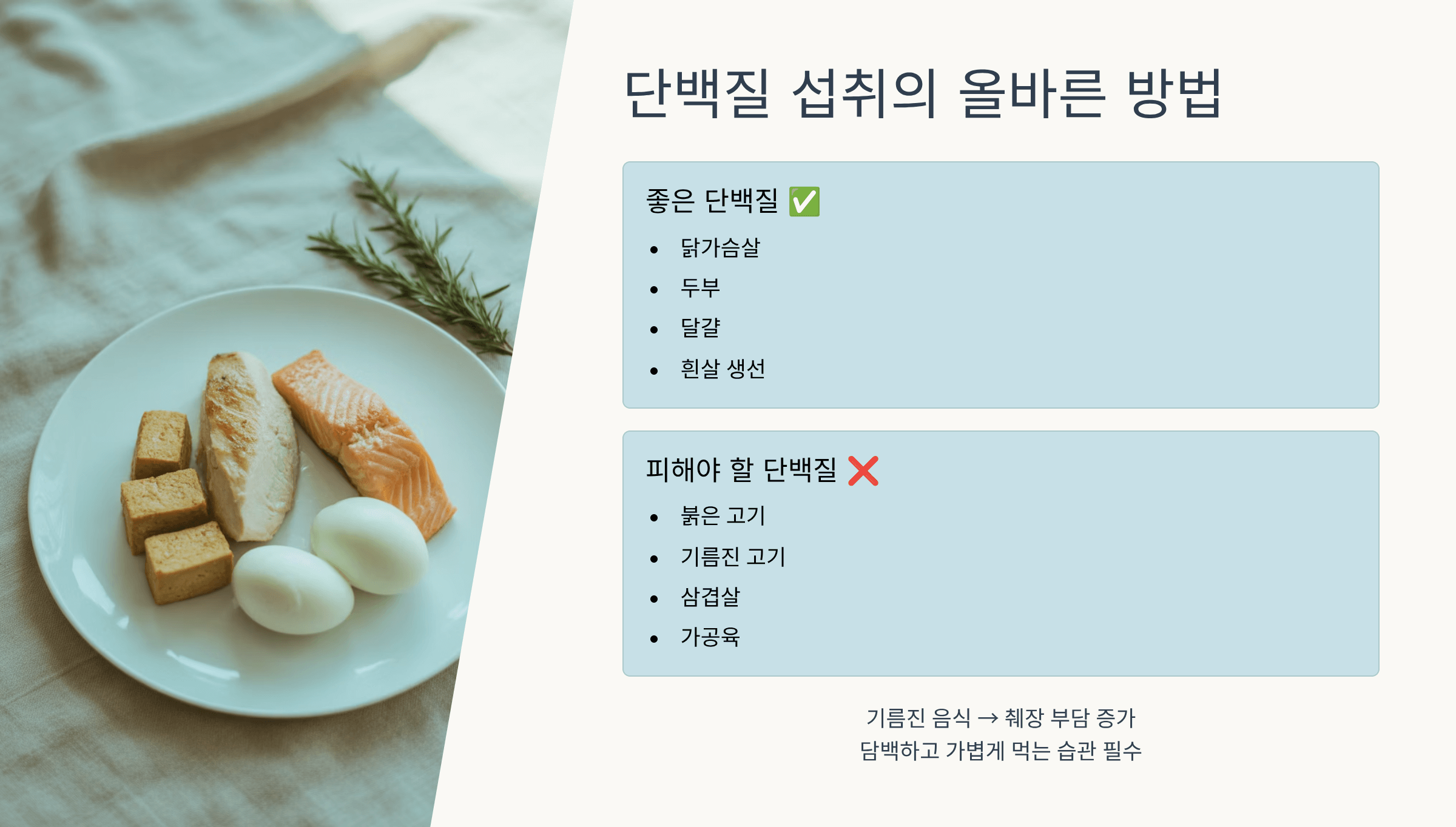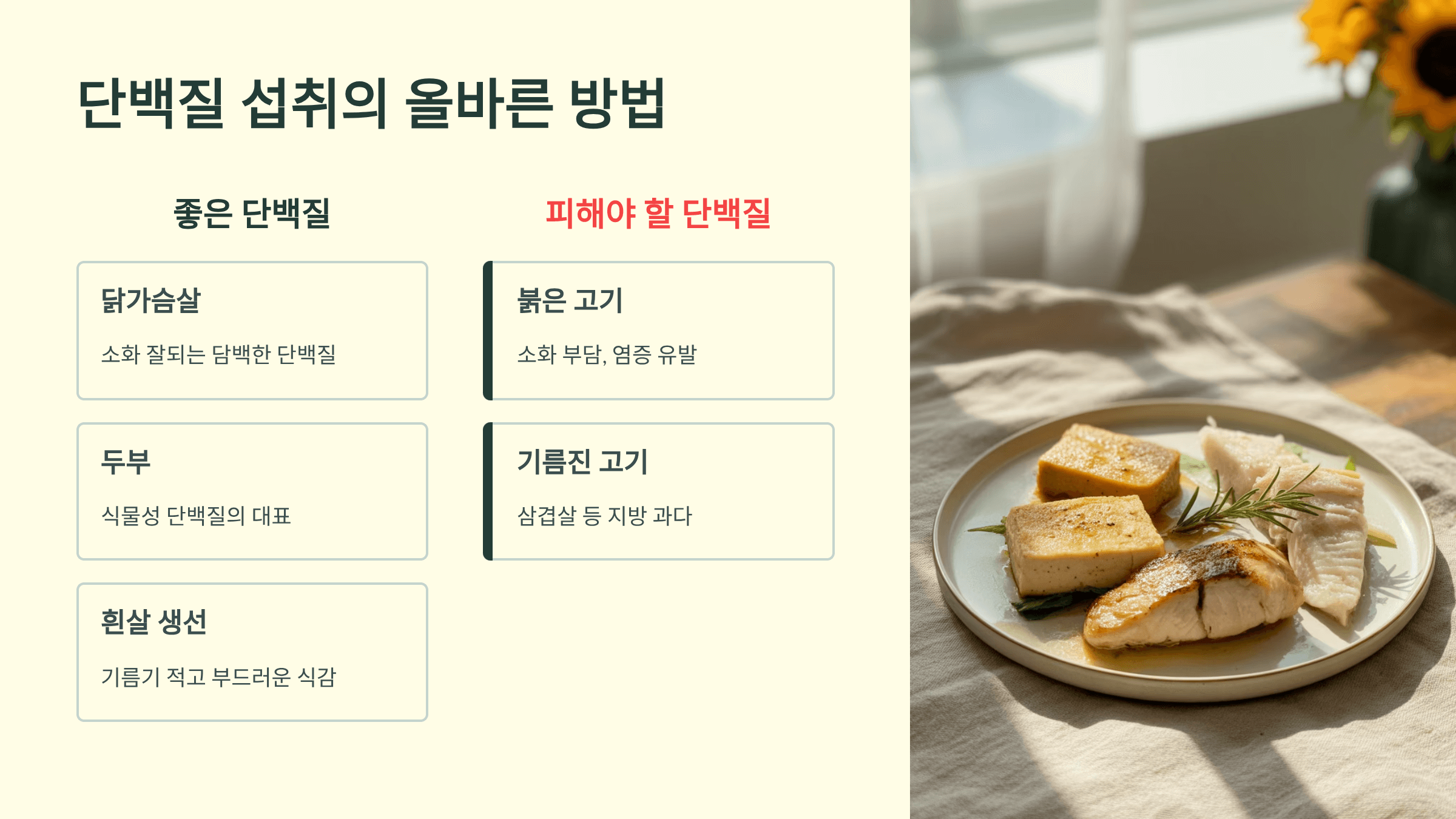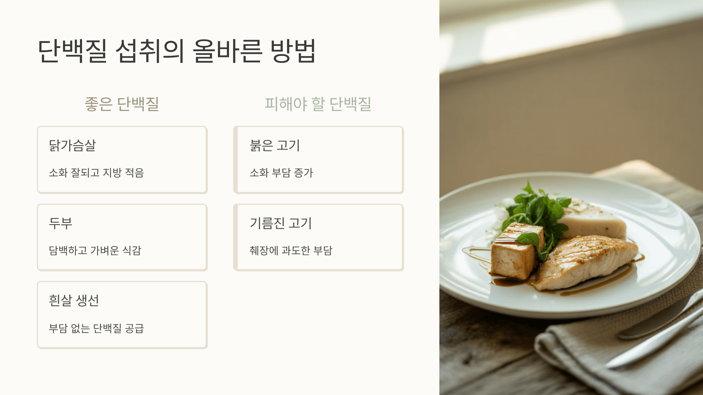 두부, 닭가슴살, 흰살 생선처럼 기름기가 적고 소화가 잘되는 단백질을 선택하세요.