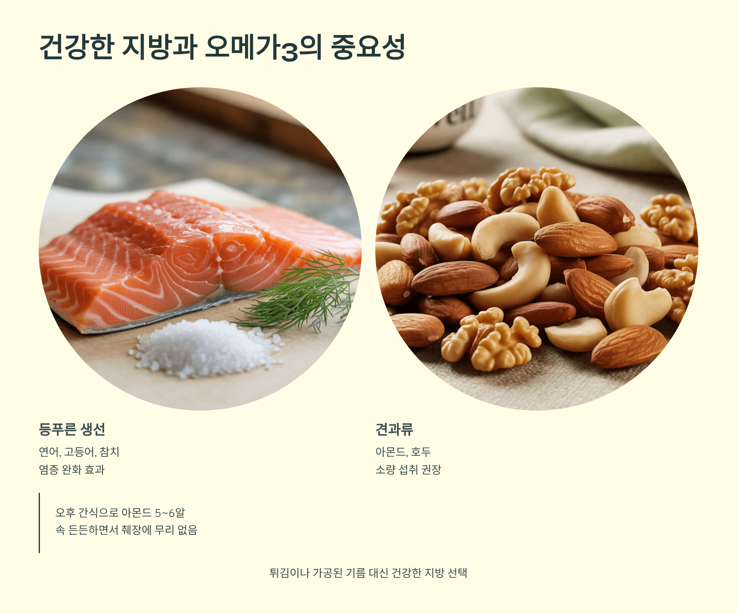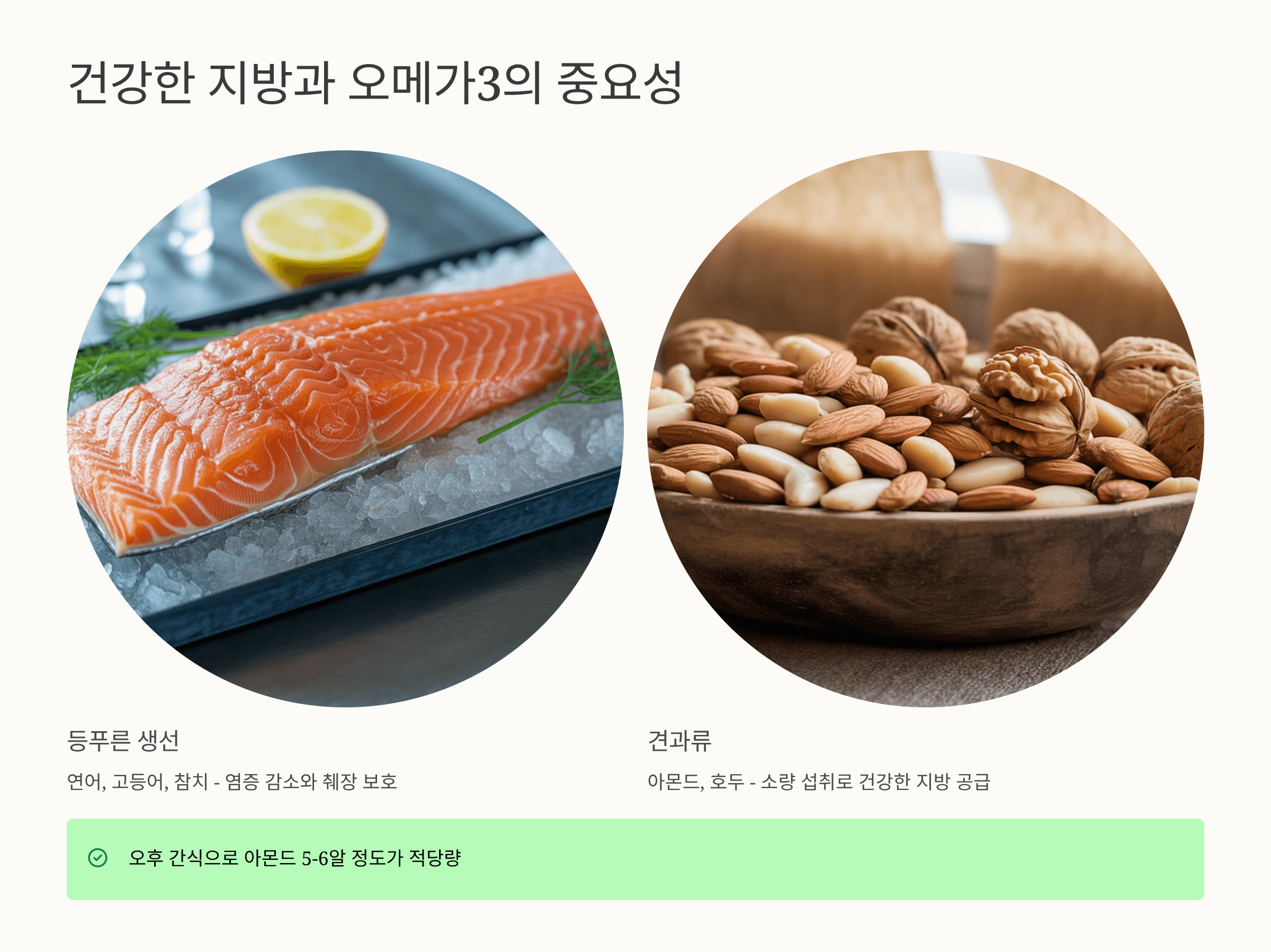 췌장에 좋은 음식으로 빼놓을 수 없는 것이 오메가3 지방산입니다. 🐟 연어, 고등어, 참치 같은 등푸른 생선에는 건강한 지방이 풍부해 염증을 줄이고 췌장을 보호합니다. 또한 아몬드, 호두 같은 견과류도 좋은 지방의 공급원이지만, 소량만 섭취하는 것이 좋아요. 저도 오후 간식으로 아몬드를 5~6알 정도 챙겨 먹는데, 속이 든든하면서도 췌장에 무리가 가지 않아 만족스럽습니다. 튀김이나 가공된 기름 대신 건강한 지방을 선택하는 것이 췌장을 위한 현명한 방법입니다.