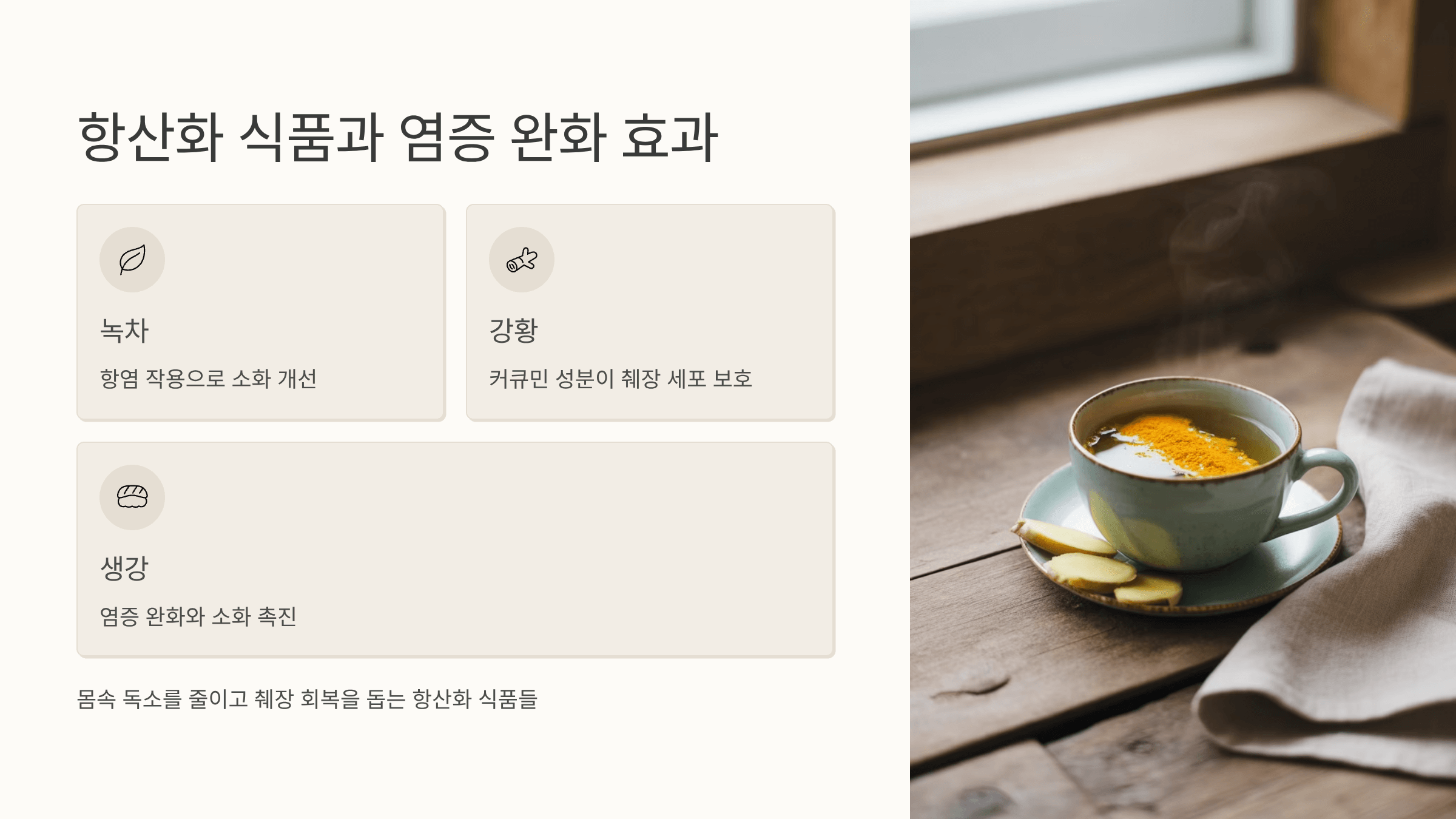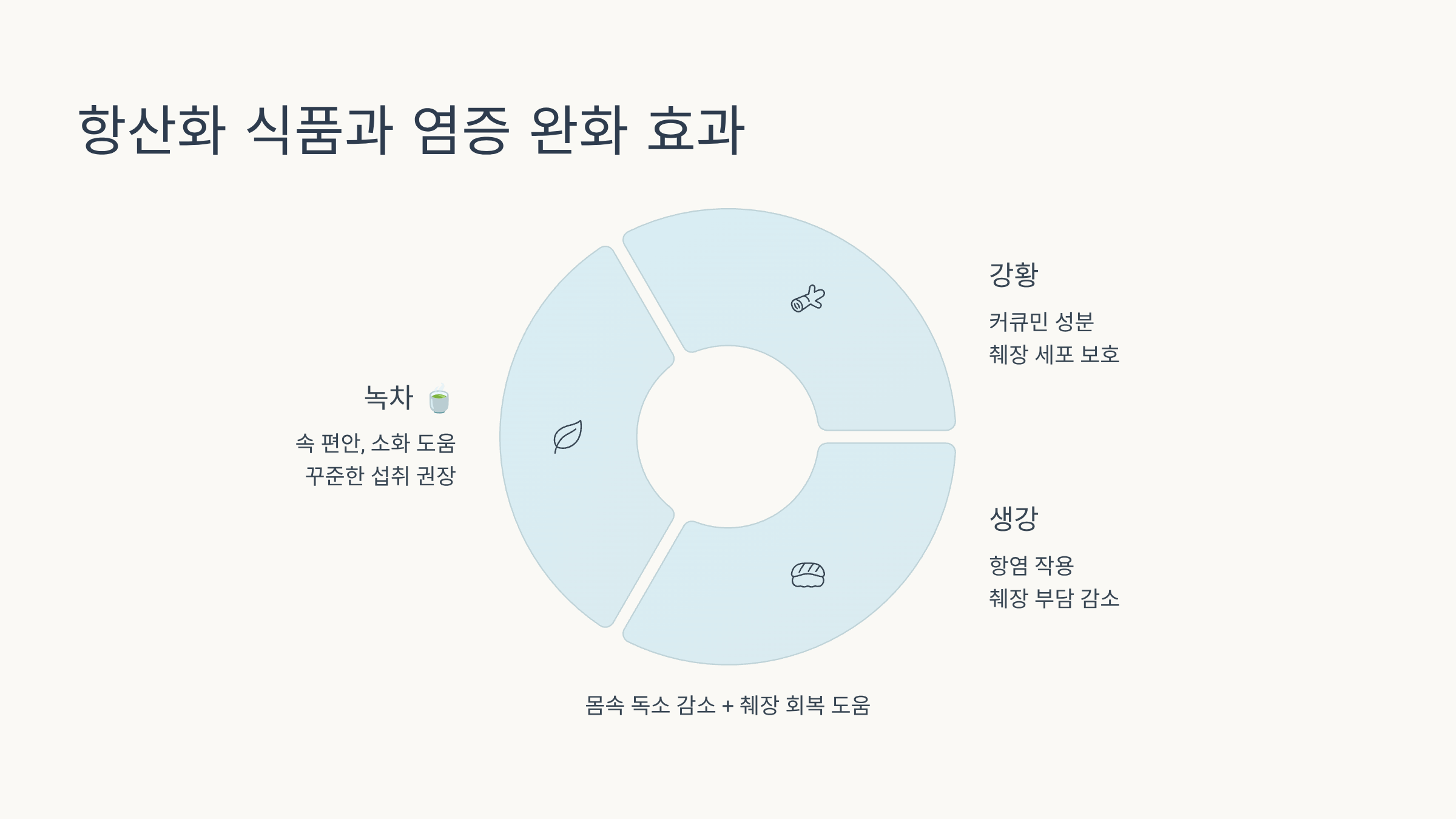 췌장은 염증에 취약하기 때문에 항산화 식품 섭취가 매우 중요합니다. 🍵 녹차, 강황, 생강 같은 항염 작용이 뛰어난 식품은 췌장의 부담을 줄여줍니다. 저는 특히 녹차를 꾸준히 마시는데, 속이 편안하고 기름진 음식을 먹은 후에도 소화가 덜 힘든 느낌을 받습니다. 또한 강황 속 커큐민 성분은 췌장 세포를 보호하는 데 효과적이라는 연구도 있습니다. 이런 항산화 식품들은 몸속 독소를 줄이고 췌장의 회복을 돕는 역할을 하므로, 일상 속에서 자주 활용해 보시는 걸 추천드립니다.