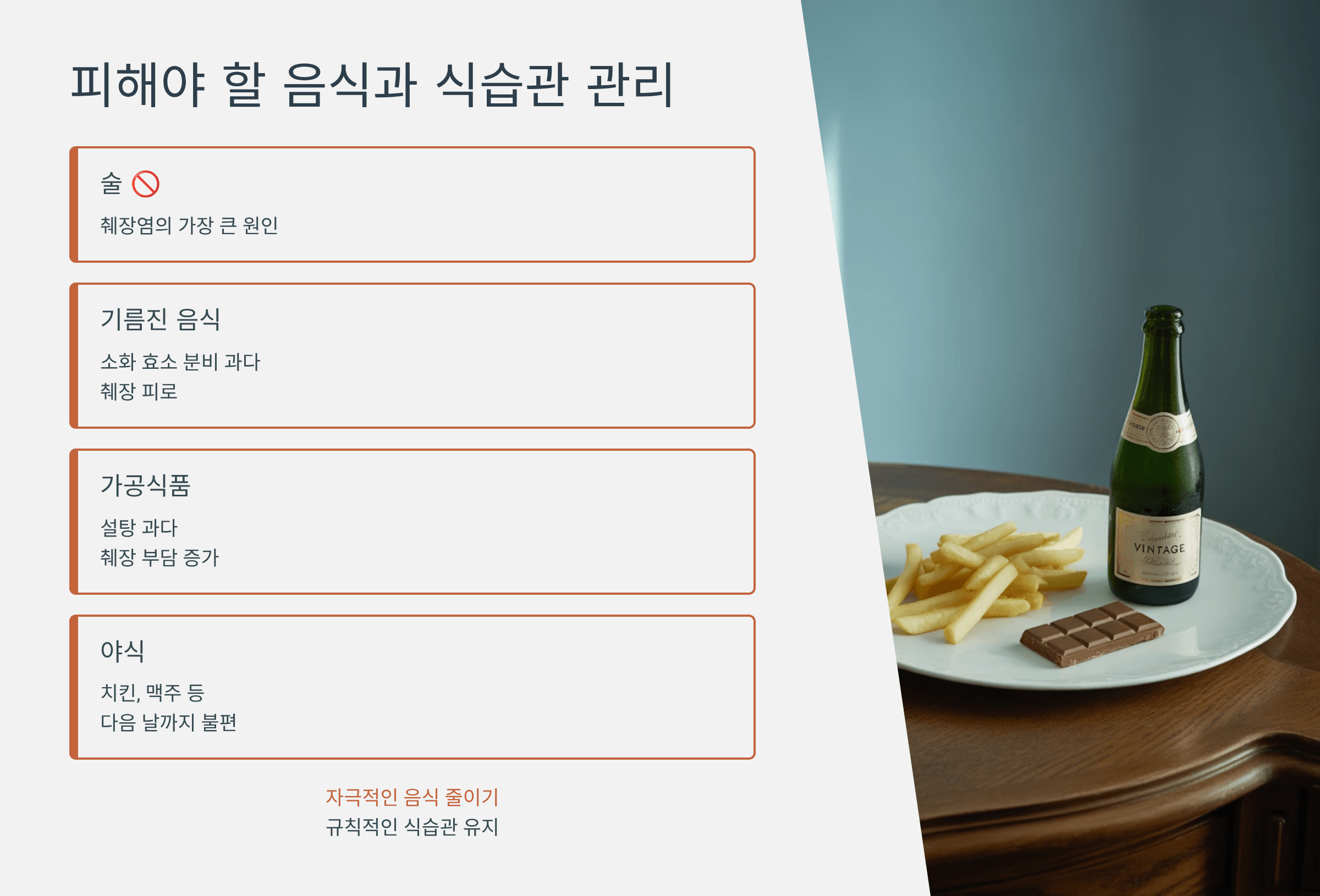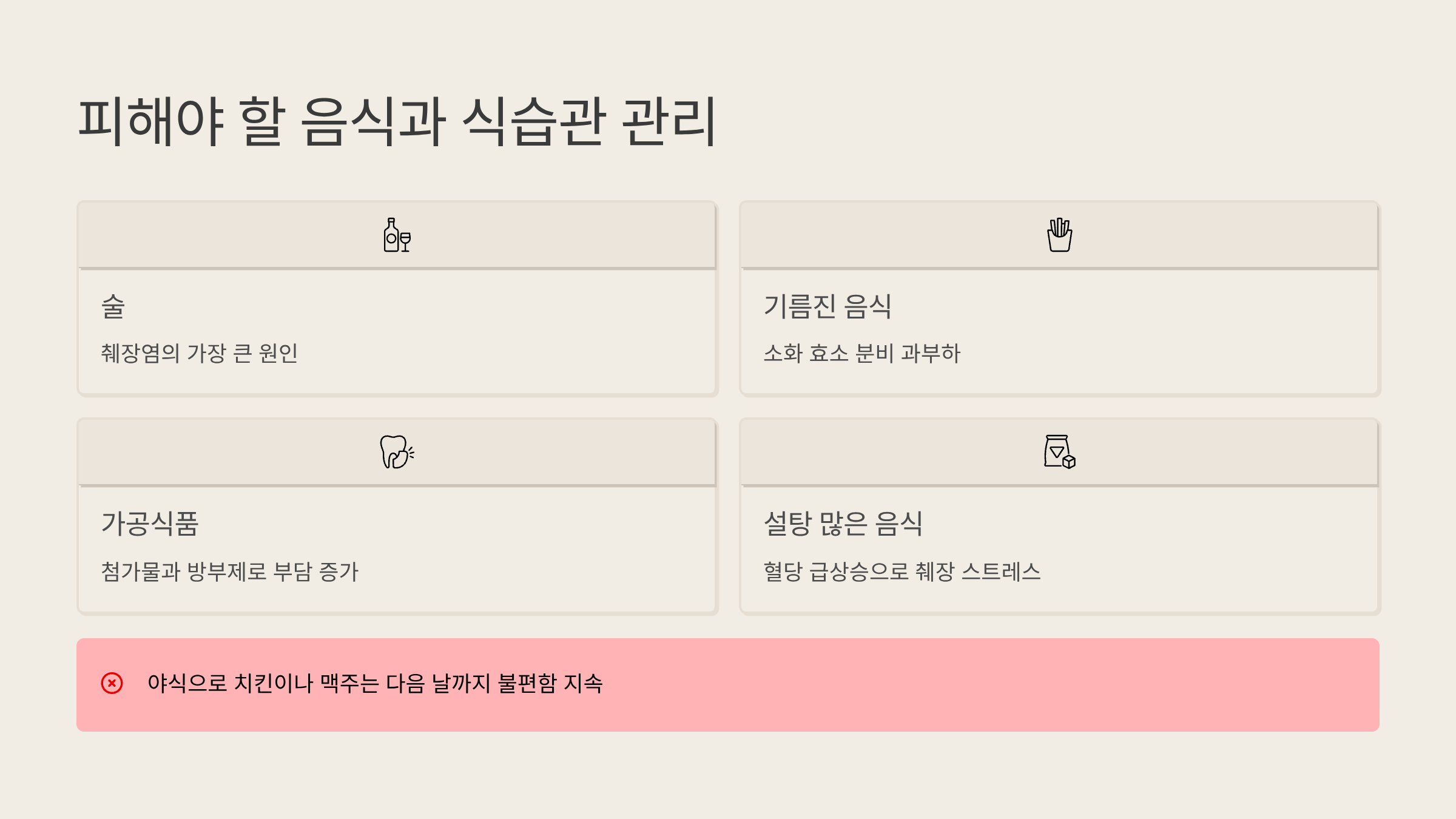 췌장 건강을 위해 꼭 피해야 할 음식들도 있습니다. 🚫 대표적으로 술, 기름진 음식, 가공식품, 설탕이 많이 든 음식이 췌장에 큰 부담을 줍니다. 실제로 술은 췌장염의 가장 큰 원인 중 하나로 꼽히고, 과도한 기름진 음식은 소화 효소 분비를 과하게 만들어 췌장을 지치게 합니다. 저도 예전에는 야식으로 치킨이나 맥주를 자주 먹었는데, 속이 무겁고 다음 날까지 불편했어요. 지금은 가급적 자극적인 음식을 줄이고, 규칙적인 식습관을 유지하면서 췌장에 부담을 줄이고 있습니다.