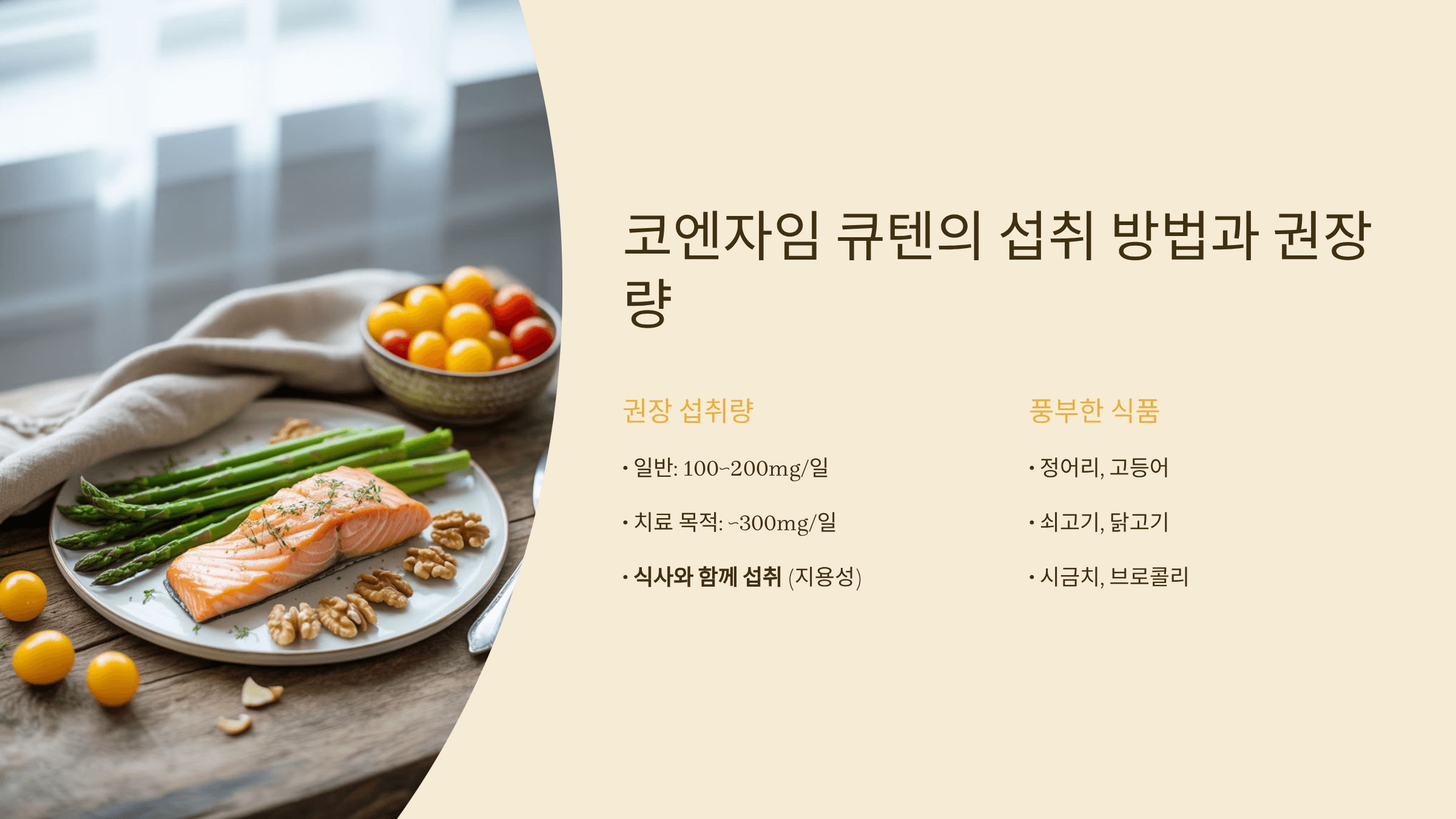 권장 섭취량은 보통 하루 100~200mg이며, 건강 목적에 따라 300mg까지 복용하기도 합니다. 지용성이므로 식사와 함께 섭취해야 흡수율이 높습니다.