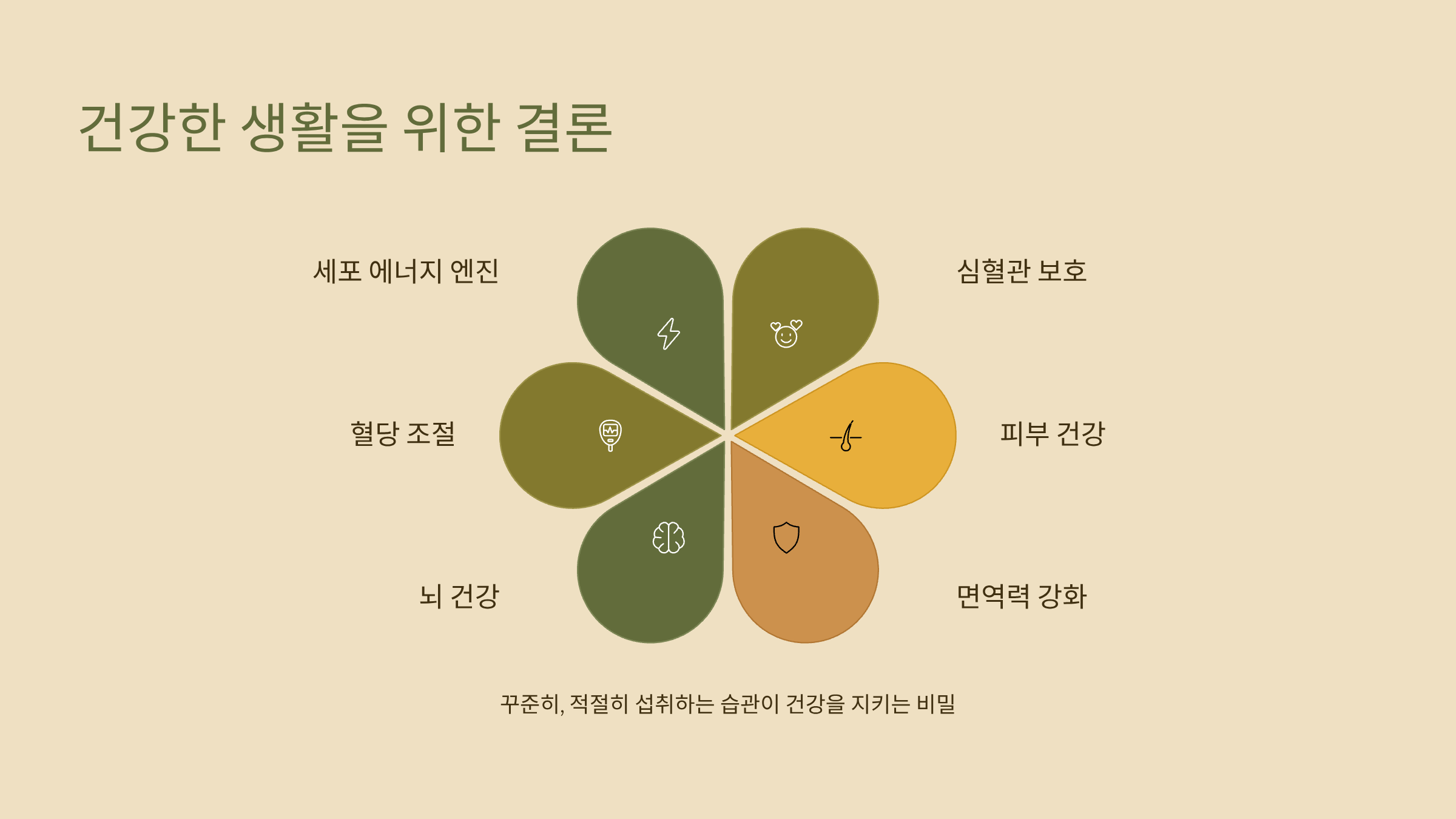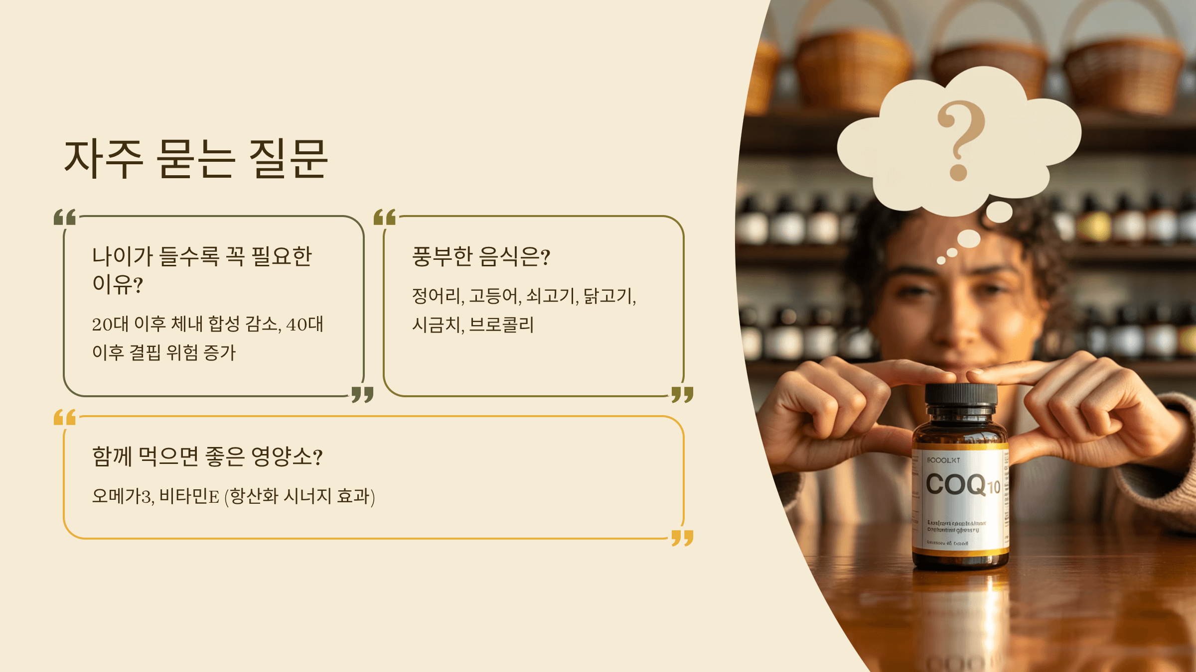 코엔자임 큐텐은 단순한 보충제가 아니라 세포 에너지의 엔진이자 노화 방지의 핵심 영양소입니다. 피로 회복, 심혈관 보호, 피부 건강, 면역력 강화, 뇌 건강, 혈당 조절까지 전신에 긍정적인 영향을 줍니다. 무엇보다 꾸준히, 그리고 적절히 섭취하는 습관이 건강을 지켜주는 비밀이라는 걸 꼭 말씀드리고 싶습니다. 🌞