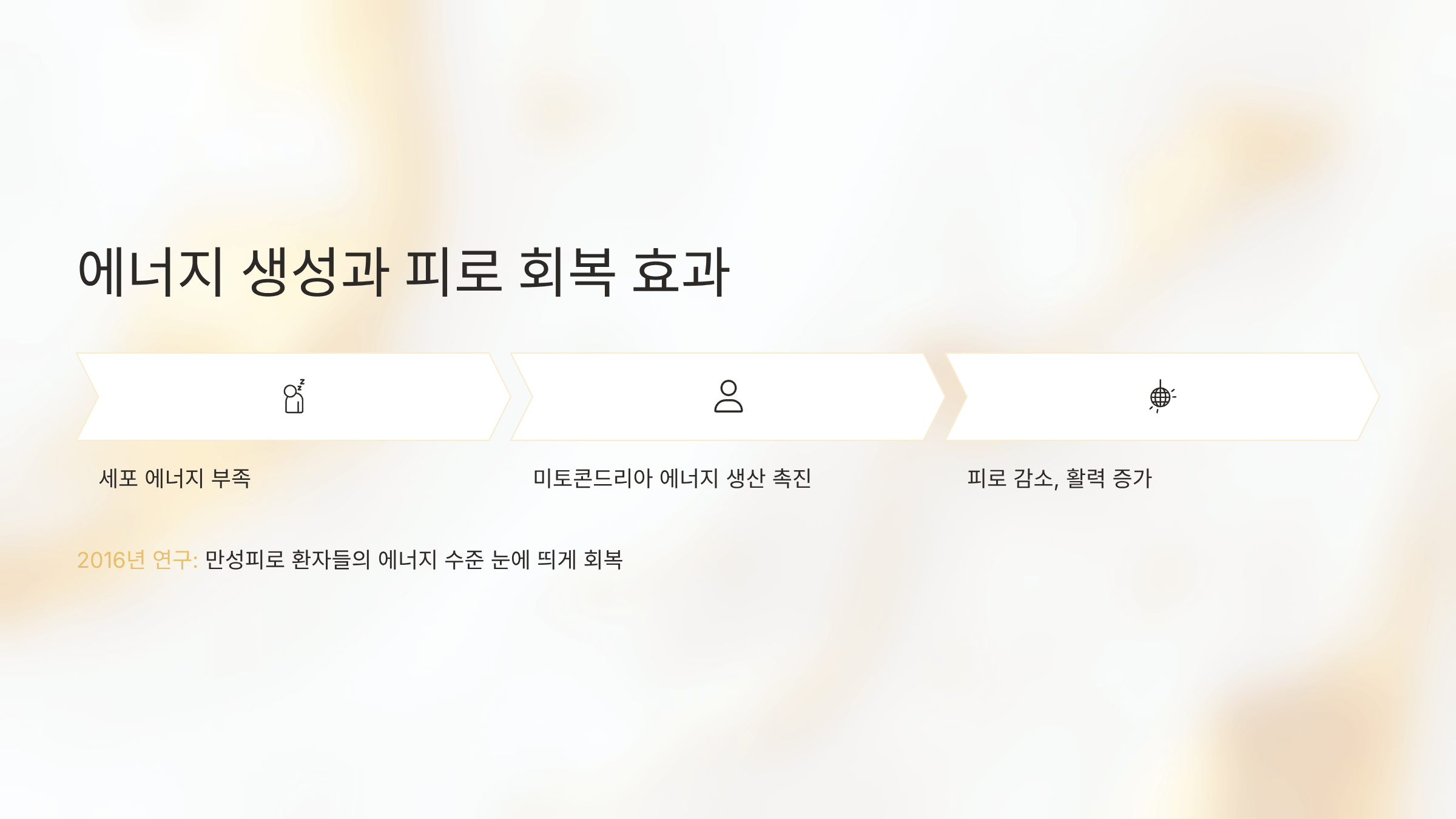 피곤함의 큰 원인은 세포가 충분한 에너지를 만들지 못하는 데 있습니다. 코엔자임 큐텐은 세포 속 미토콘드리아에서 에너지 생산을 촉진해 피로를 줄이고 활력을 높여줍니다. 2016년 Journal of Clinical Biochemistry and Nutrition 논문에서는 코엔자임 큐텐을 섭취한 만성피로 환자들의 에너지 수준이 눈에 띄게 회복된 결과가 발표되었습니다. 저도 주말마다 운동 후 지치던 몸이 코엔자임 큐텐을 섭취한 후 확실히 회복이 빨라진 걸 느꼈습니다. 🏃