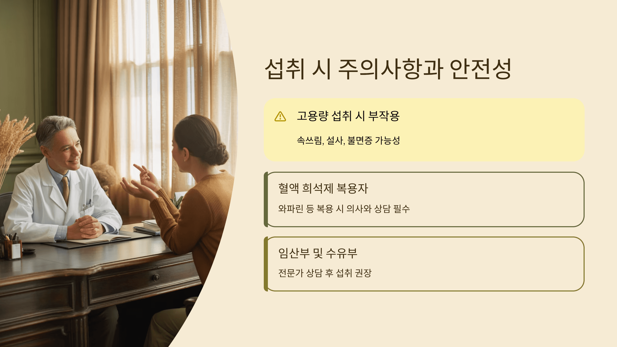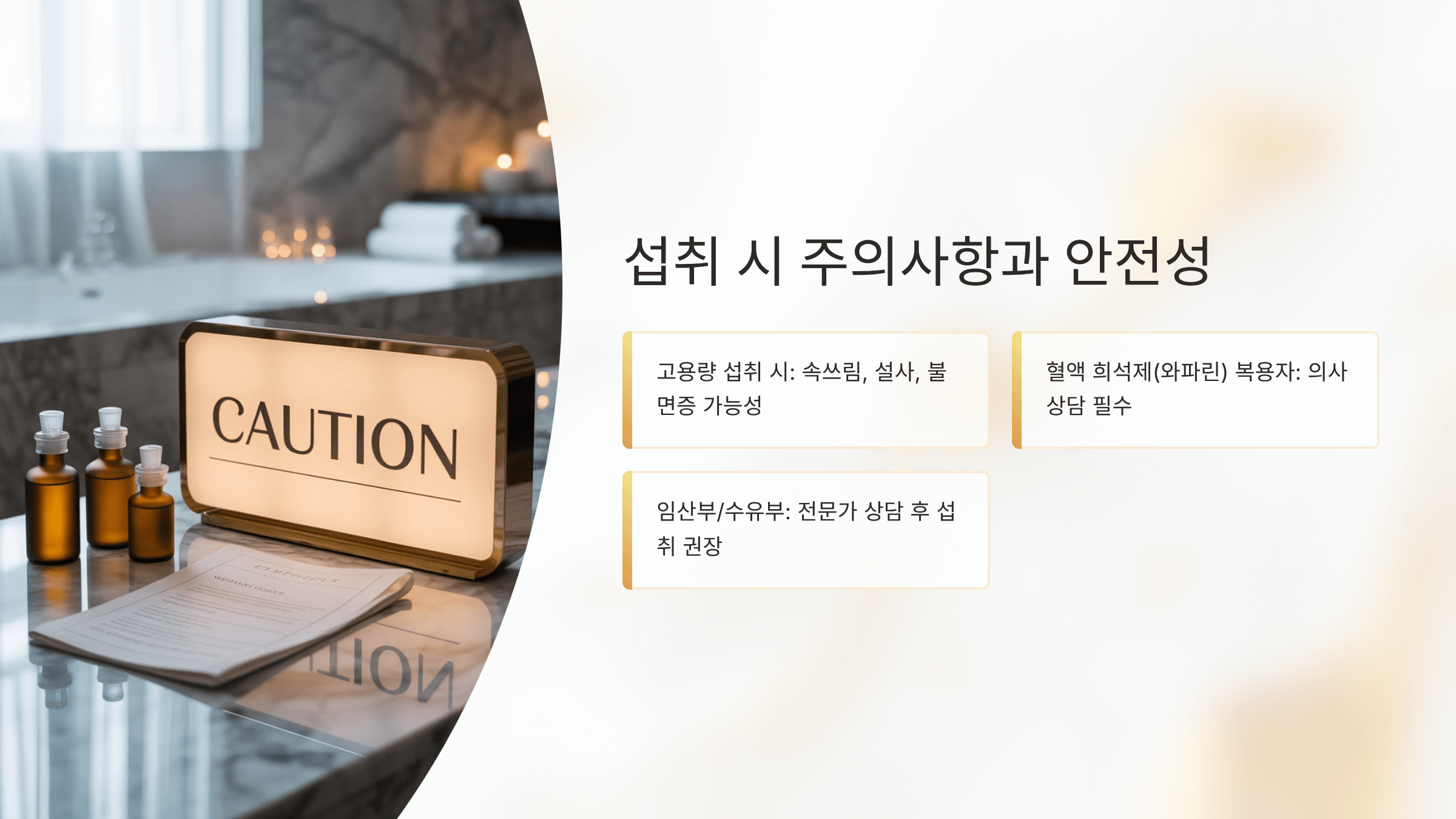 코엔자임 큐텐은 비교적 안전한 성분이지만, 고용량 섭취 시 속쓰림, 설사, 불면증 등의 부작용이 있을 수 있습니다. 혈액 희석제(와파린 등)를 복용 중인 분들은 반드시 의사와 상담 후 복용해야 합니다. 또한 임산부와 수유부는 전문가 상담 후 섭취하는 것이 안전합니다. ⚠️