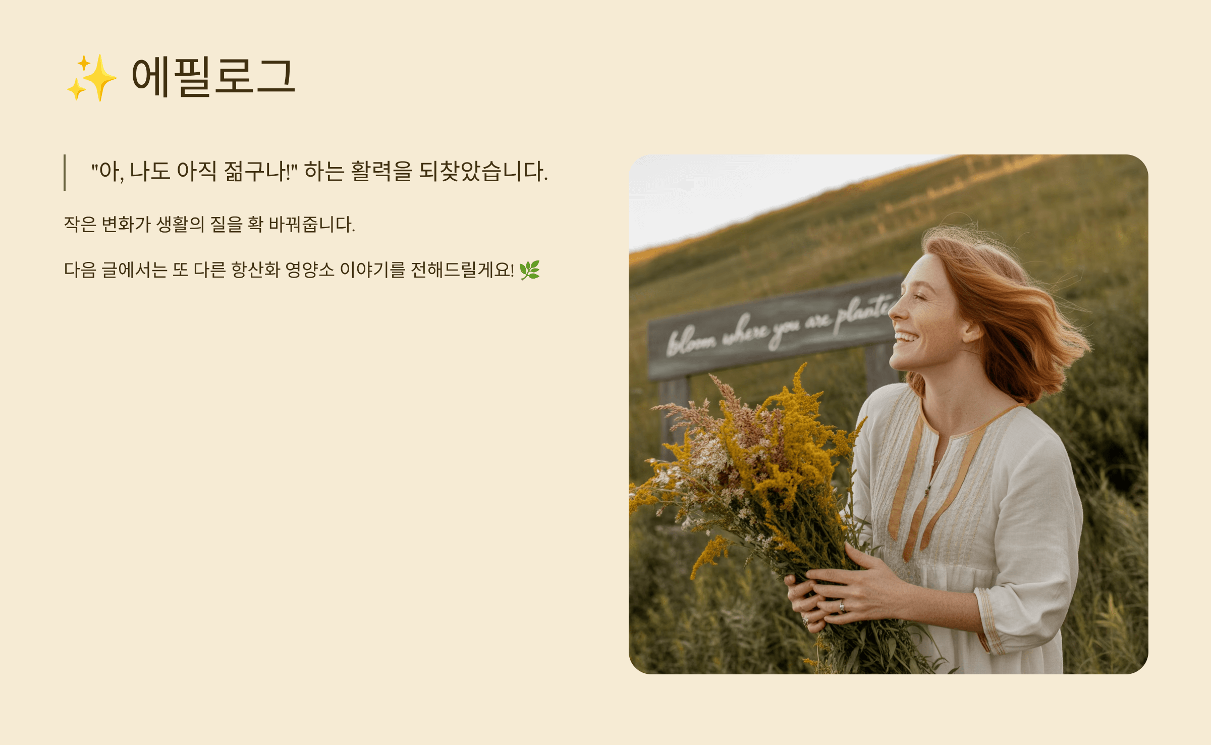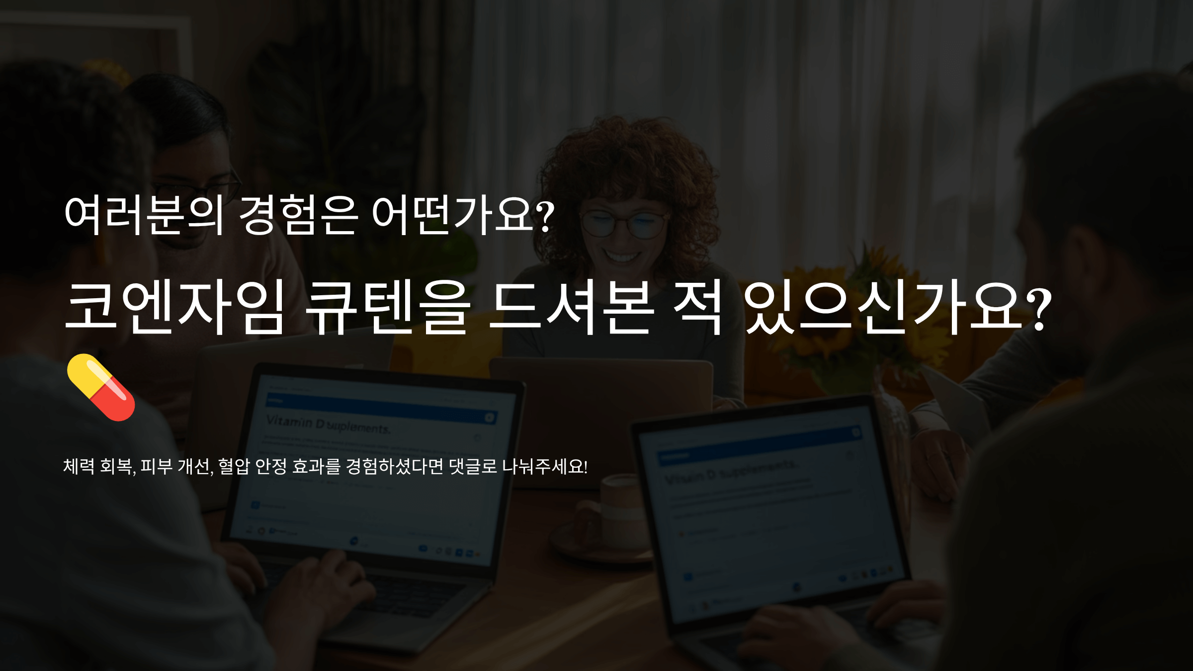 저는 코엔자임 큐텐을 꾸준히 챙겨 먹으면서 “아, 나도 아직 젊구나!” 하는 활력을 되찾았습니다. 작은 변화가 생활의 질을 확 바꿔준다는 걸 느끼고 있습니다. 다음 글에서는 또 다른 항산화 영양소 이야기를 전해드릴게요!