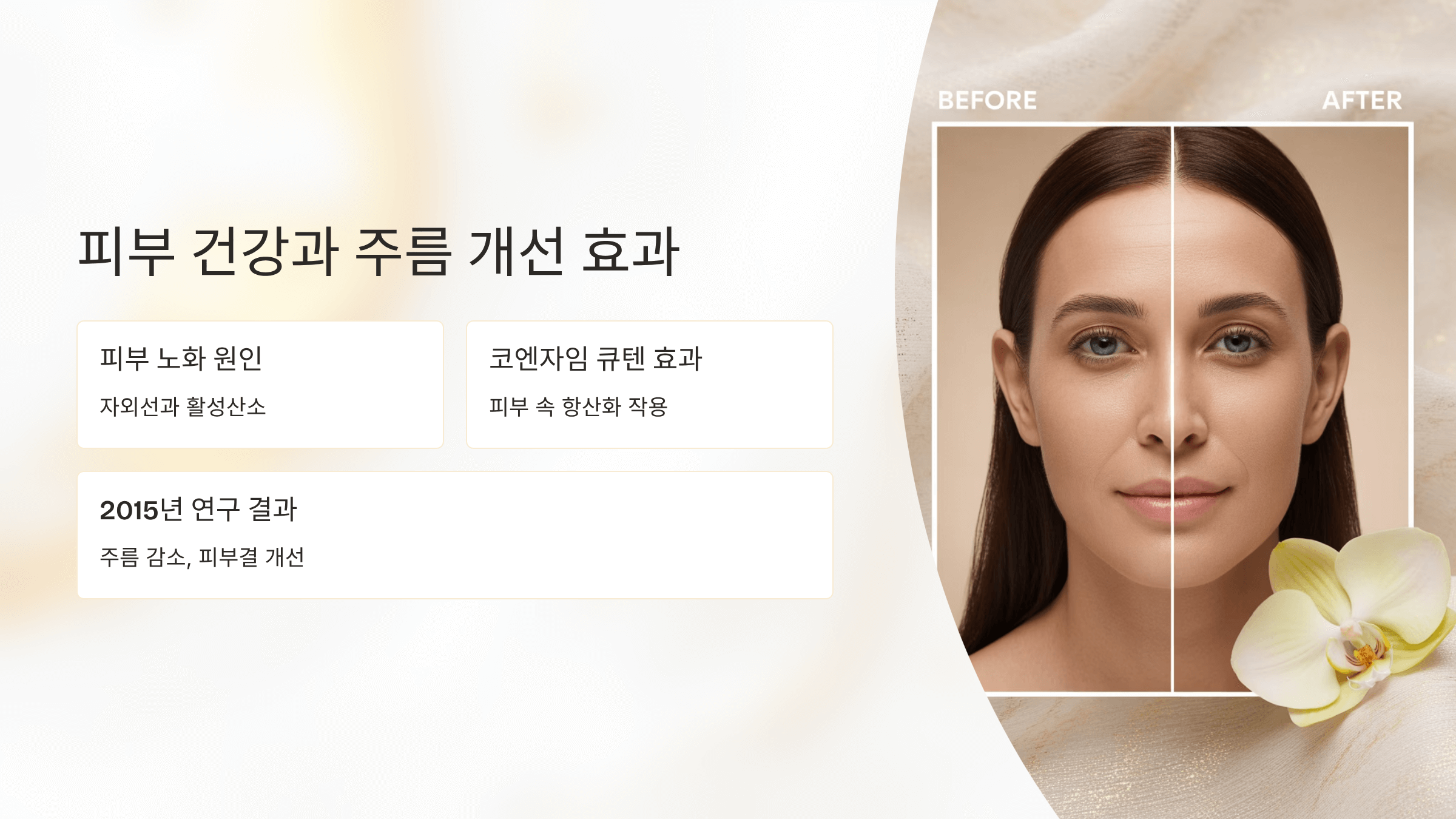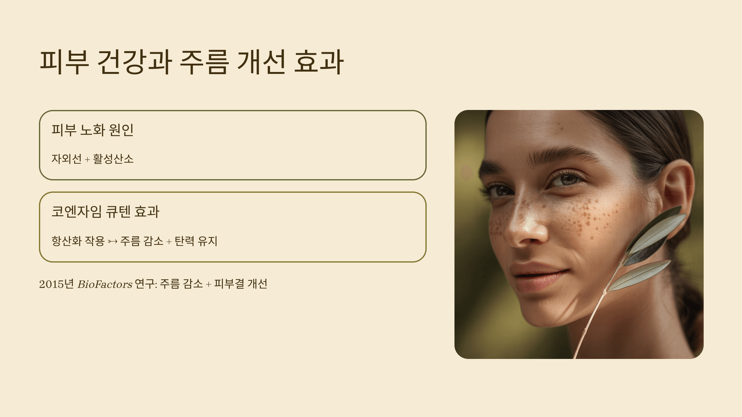 피부 노화의 원인은 자외선과 활성산소인데, 코엔자임 큐텐은 피부 속에서 항산화 작용을 하며 주름과 탄력 저하를 늦춰줍니다. 2015년 BioFactors 연구에 따르면 코엔자임 큐텐을 포함한 크림을 바른 그룹에서 주름이 감소하고 피부 결이 매끄러워졌다는 결과가 있습니다. 저도 코엔자임 큐텐 화장품을 사용했을 때 피부가 탄탄해지는 느낌이 확실히 있었습니다. 🌼