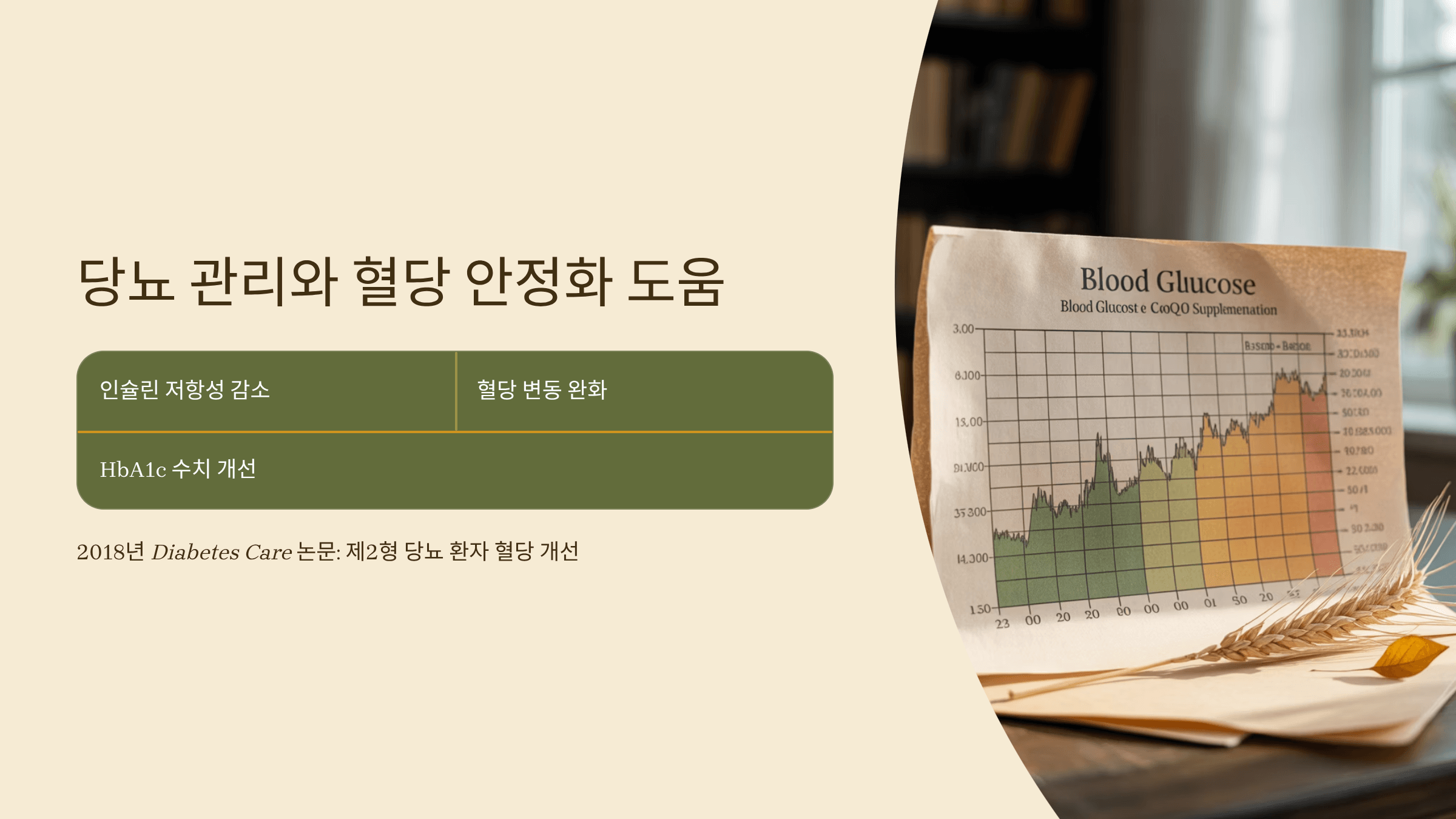 코엔자임 큐텐은 혈당 조절에도 도움을 줍니다. 인슐린 저항성을 낮추고 혈당 변동을 완화해 당뇨 관리에 긍정적인 역할을 합니다. 2018년 Diabetes Care 논문에서는 제2형 당뇨 환자가 코엔자임 큐텐을 섭취했을 때 혈당 수치와 HbA1c가 개선된 결과가 발표되었습니다. 당뇨가 있는 지인도 코엔자임 큐텐을 꾸준히 섭취한 후 혈당 관리가 한결 수월해졌다고 하더군요. 🍎