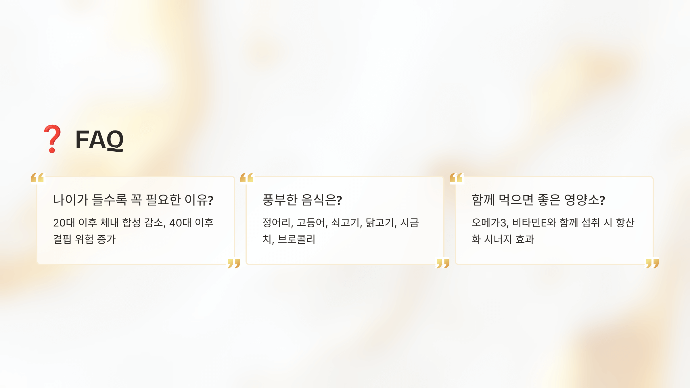 20대 이후 체내 합성이 줄어들어 40대 이후에는 결핍 위험이 크기 때문입니다.