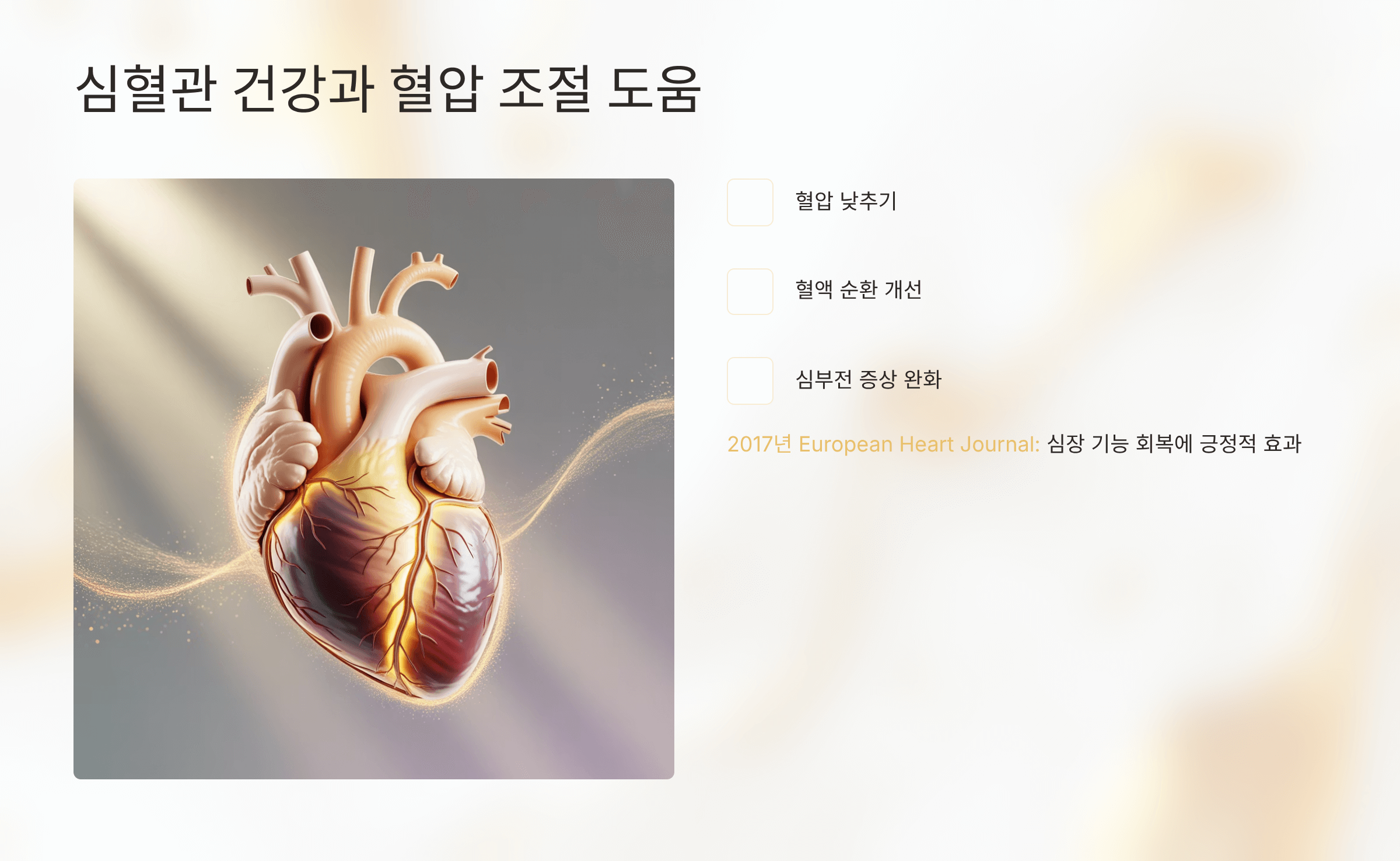 심장은 하루 종일 끊임없이 에너지를 쓰는 기관이기 때문에 코엔자임 큐텐 부족 시 가장 큰 영향을 받습니다. 연구에 따르면 코엔자임 큐텐은 혈압을 낮추고 혈액 순환을 개선하며 심부전 환자의 증상을 완화하는 효과가 있습니다. 2017년 European Heart Journal에서는 코엔자임 큐텐을 복용한 환자 그룹이 심장 기능 회복에 긍정적 반응을 보였다고 발표했습니다. 부모님께서도 꾸준히 드시는데, 예전보다 혈압이 안정적이라고 하셔서 안심이 됩니다. ❤️