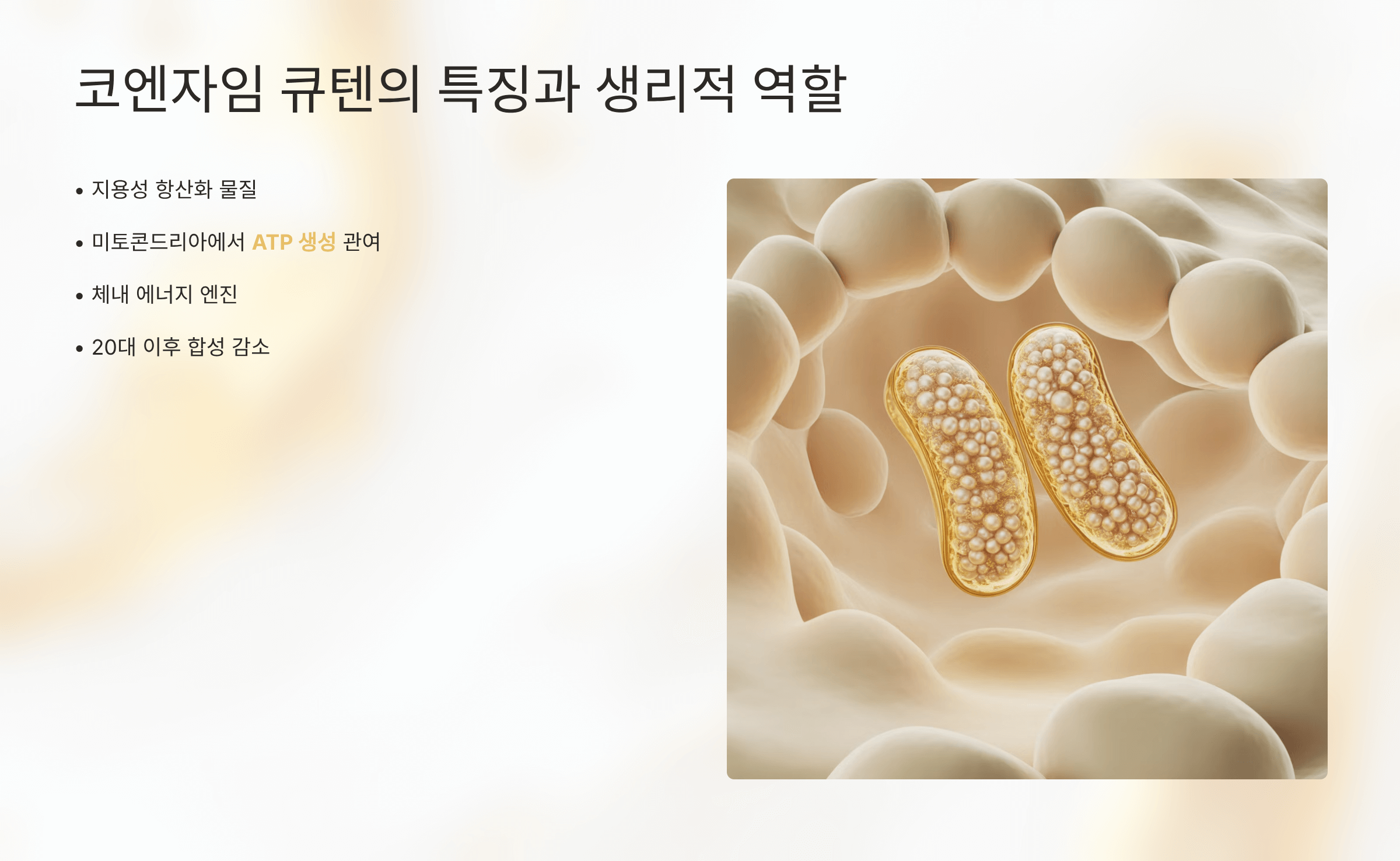 코엔자임 큐텐(Coenzyme Q10)은 지용성 항산화 물질로, 세포 내 미토콘드리아에서 ATP 생성에 직접 관여합니다. 우리 몸의 에너지 엔진이라 불릴 정도로 중요한 역할을 하며, 체내 합성은 20대 이후 점차 줄어들기 때문에 중년 이후에는 결핍되기 쉽습니다. 저도 예전에는 그냥 영양제 중 하나라고 생각했지만, 알고 보니 세포 에너지를 공급하는 핵심 요소라는 걸 알고부터는 꼭 챙기게 되었습니다. ⚡