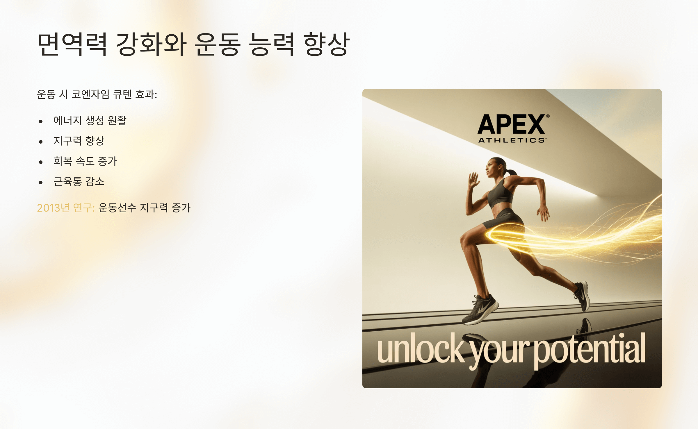 운동할 때 코엔자임 큐텐이 부족하면 에너지 생성이 원활하지 않아 쉽게 지치게 됩니다. 반대로 충분히 보충하면 운동 능력이 향상되고 회복 속도가 빨라집니다. 2013년 Journal of the International Society of Sports Nutrition에서는 운동선수가 코엔자임 큐텐을 섭취했을 때 지구력이 늘어나고 피로 회복이 빨라졌다고 보고했습니다. 저도 달리기 후 근육통이 줄어든 걸 경험했는데, 운동하는 분들께 강력 추천드리고 싶습니다. 💪