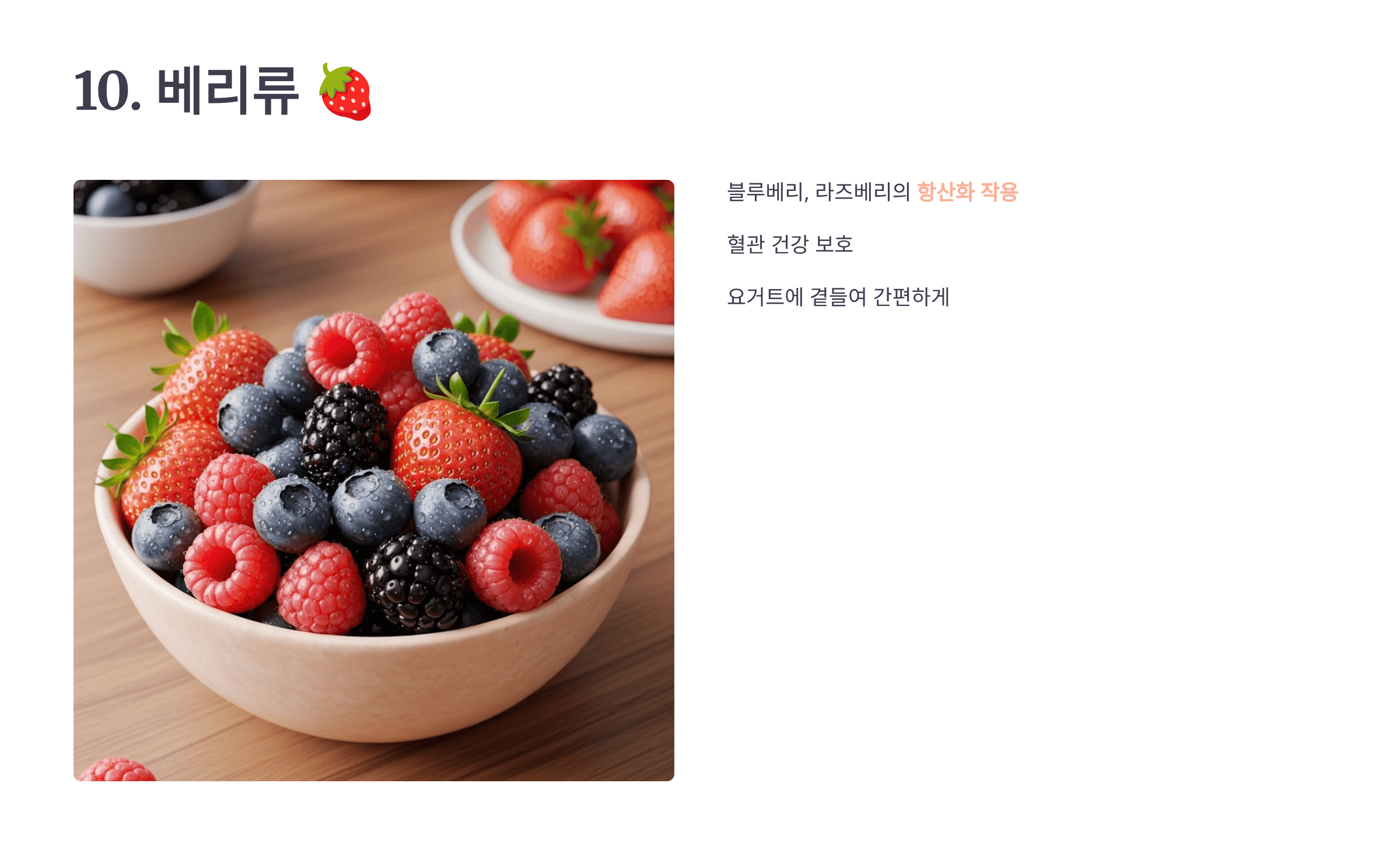 블루베리, 라즈베리 같은 베리류는 항산화 작용으로 혈관 건강을 지켜줍니다.