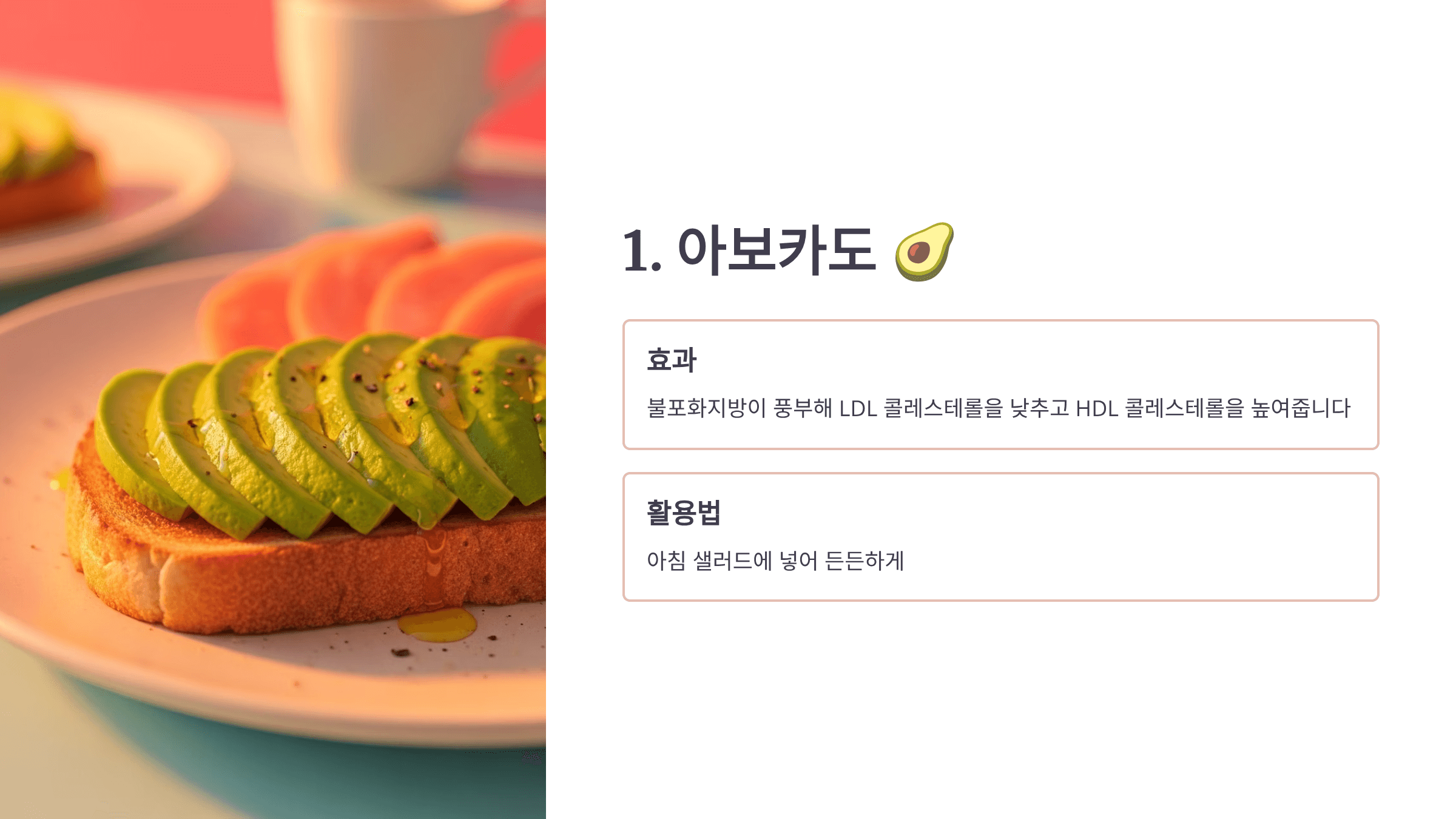 저는 아침 샐러드에 아보카도를 넣어 먹는데, 하루가 훨씬 든든해요.