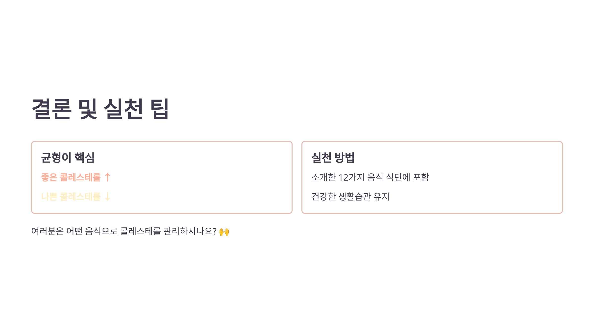 여러분은 콜레스테롤 관리 위해 어떤 음식을 챙겨 드시나요? 댓글로 나만의 비법을 공유해주세요! 🙌