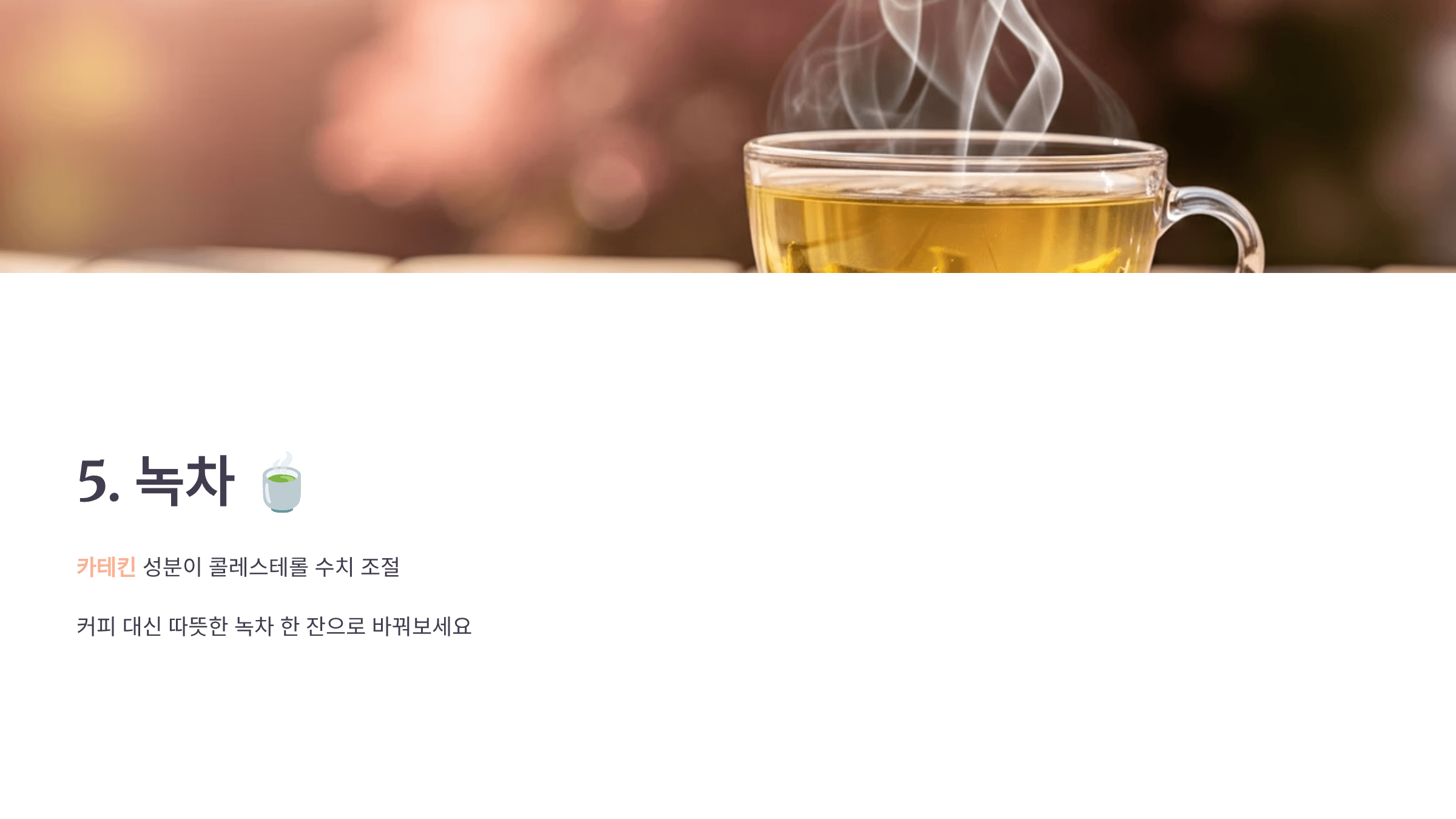 커피 대신 따뜻한 녹차 한 잔으로 바꿔보세요.