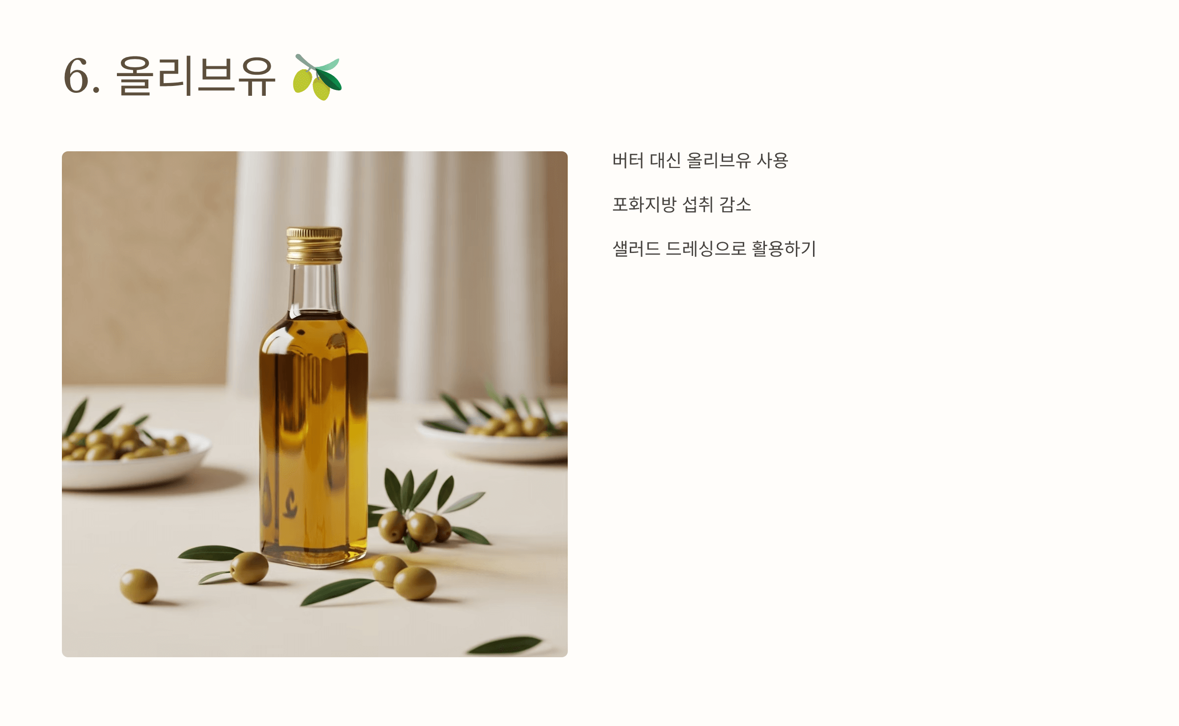 버터 대신 올리브유를 사용하면 포화지방 섭취를 줄여 콜레스테롤 개선에 효과적입니다.