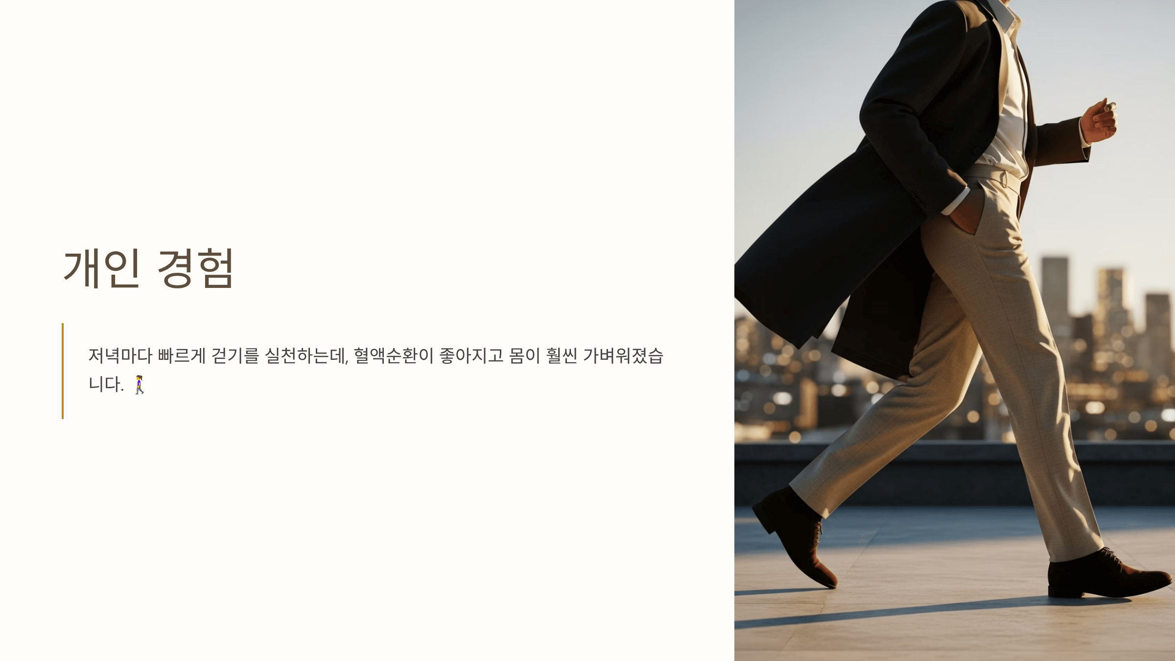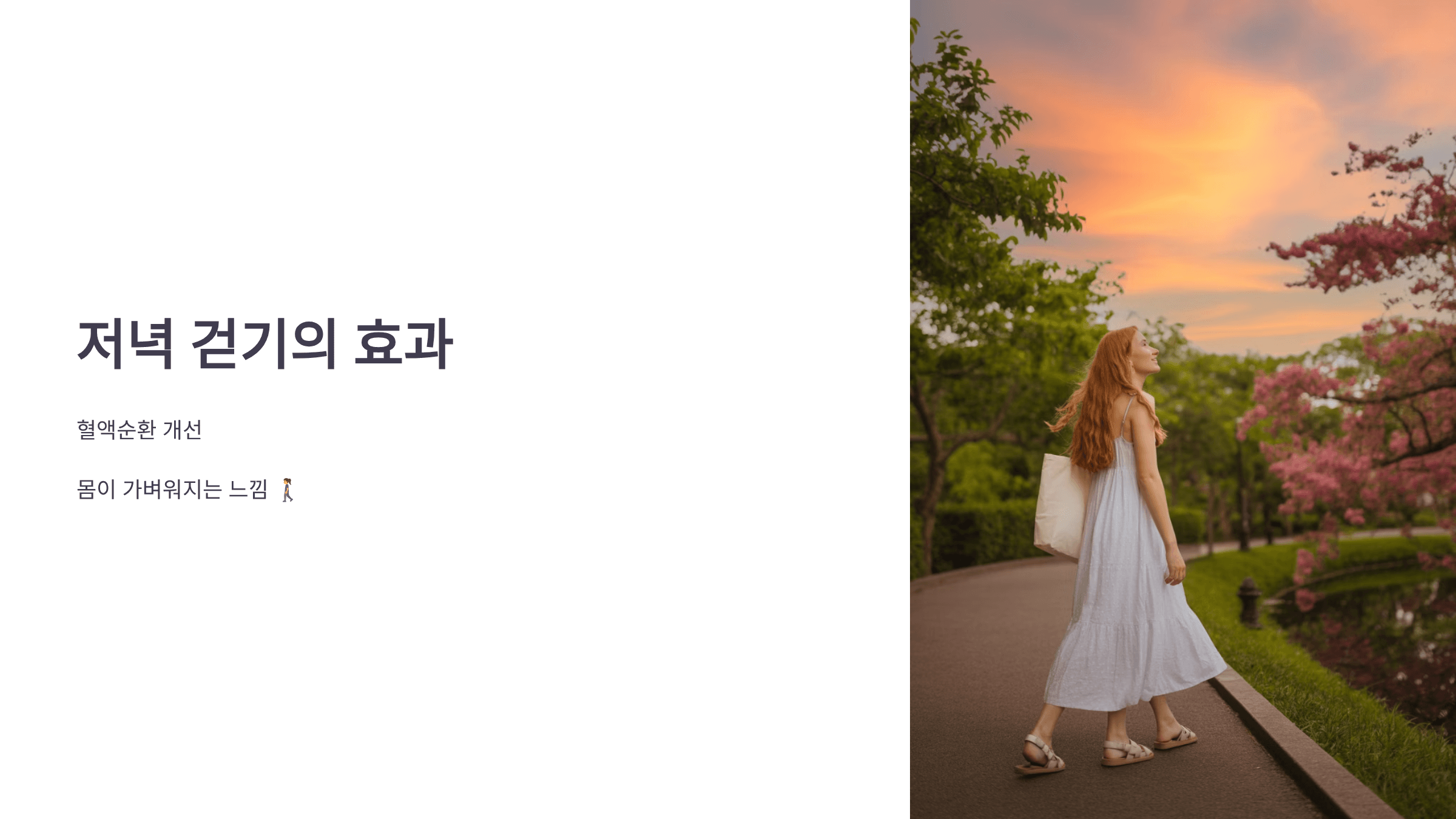 저는 저녁마다 빠르게 걷기를 실천하는데, 혈액순환이 좋아지고 몸이 훨씬 가벼워졌습니다. 🚶♀️