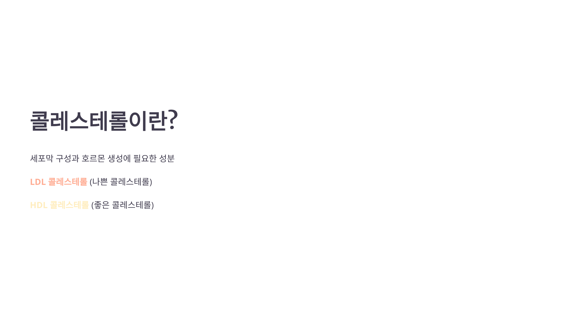 하지만 LDL 콜레스테롤(나쁜 콜레스테롤)이 과도하면 혈관에 플라크가 쌓여 혈류가 막히고, 결국 동맥경화나 뇌졸중 같은 심각한 질환으로 이어질 수 있습니다.