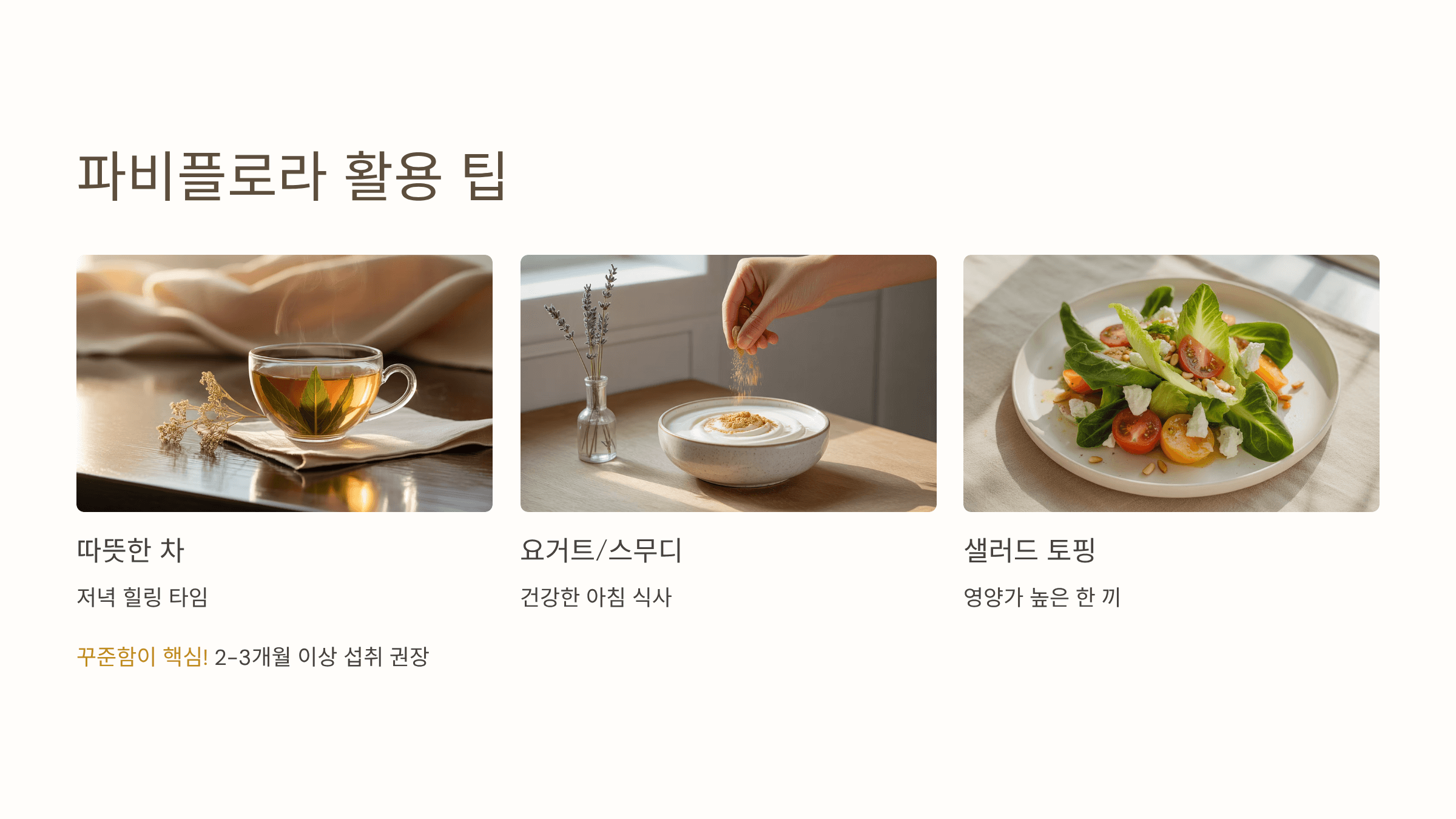 파비플로라는 단순히 건강 보조제처럼만 먹는 게 아니라, 차로 우려서 마시거나 샐러드에 곁들이는 등 다양한 활용이 가능합니다 ☕🥗. 저는 저녁에 따뜻한 차로 마시는 걸 가장 좋아하는데, 그 시간이 하루의 스트레스를 내려놓는 힐링 시간이 되어줍니다.