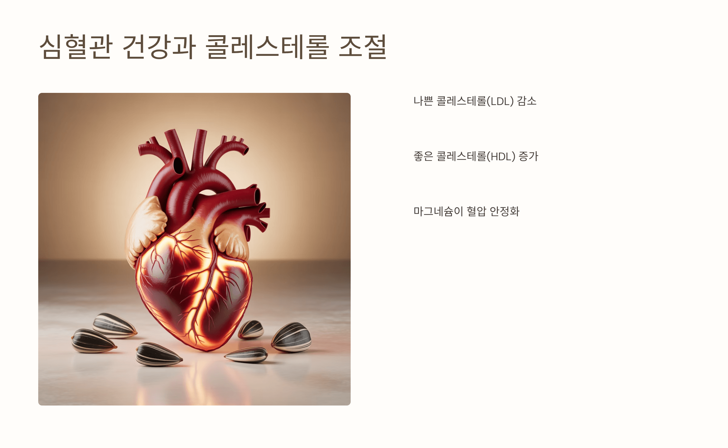 해바라기씨의 불포화지방산은 혈중 나쁜 콜레스테롤(LDL)을 낮추고 좋은 콜레스테롤(HDL)을 높여 심장병과 동맥경화 예방에 도움을 줍니다. 또 마그네슘은 혈압을 안정시켜 고혈압 예방에도 효과적이에요. 저희 부모님도 꾸준히 드시는데, 혈압 관리가 잘 되어 확실히 도움을 받고 계십니다. 🫀