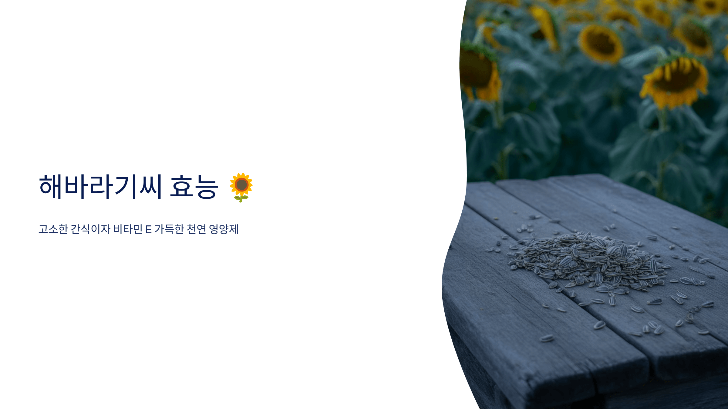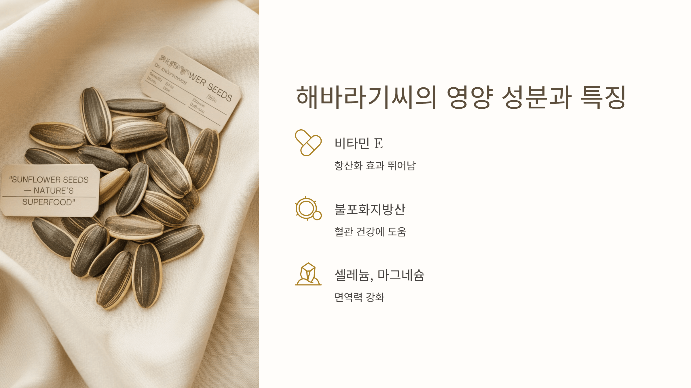 해바라기씨에는 비타민 E, 불포화지방산, 셀레늄, 마그네슘, 단백질, 식이섬유가 풍부합니다. 특히 비타민 E 함량이 높아 항산화 효과가 뛰어나고, 불포화지방산은 혈관 건강에 도움을 줍니다. 저는 출출할 때 해바라기씨를 한 줌 먹으면 고소하면서도 든든해져서 과자를 덜 찾게 되더라고요. 🌻