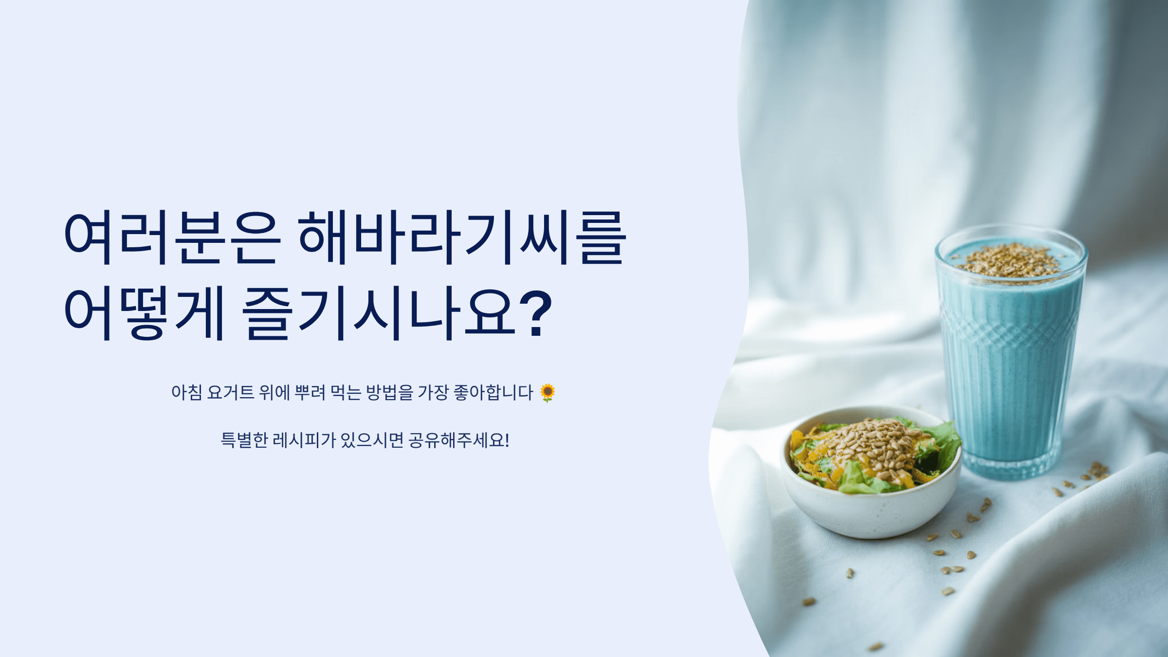 여러분은 해바라기씨를 어떻게 즐기시나요? 저는 아침 요거트 위에 뿌려 먹는 걸 가장 좋아합니다. 혹시 특별한 레시피나 드시는 방법 있으시면 댓글로 공유해주세요. 🌻