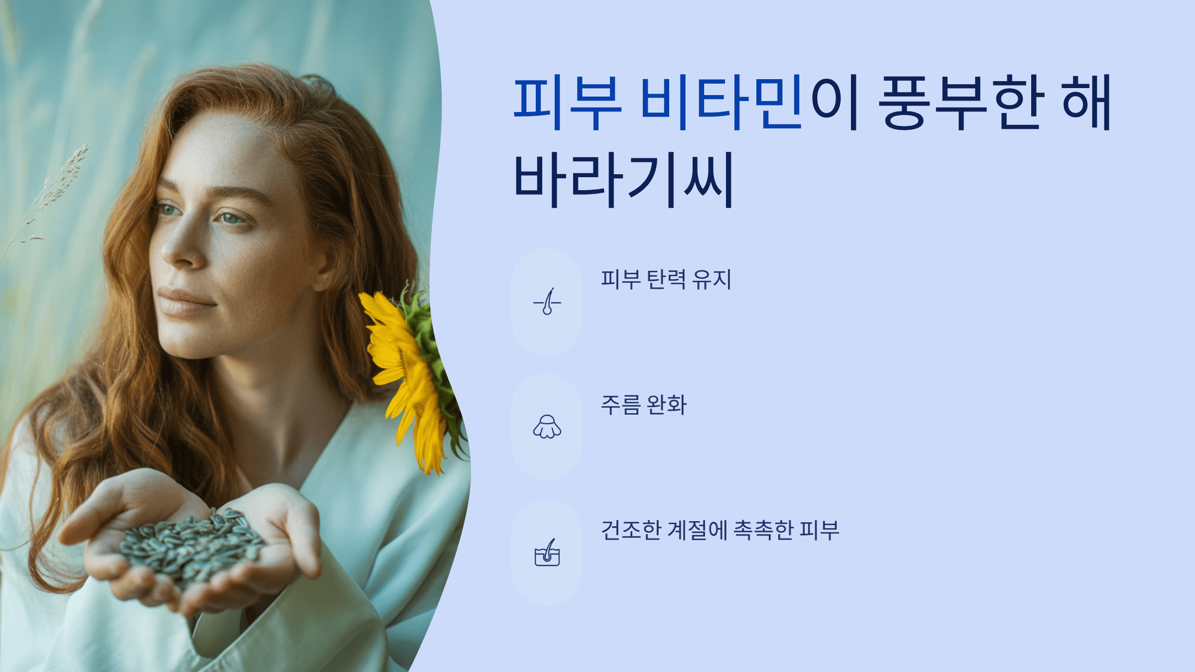 해바라기씨는 ‘피부 비타민’이라고 불리는 비타민 E가 풍부합니다. 이는 피부 탄력을 유지하고 주름을 완화하는 데 도움을 줘요. 특히 건조한 계절에 먹으면 피부가 촉촉해지고 건강해지는 걸 체감할 수 있습니다. 저는 겨울마다 피부가 푸석했는데, 해바라기씨 덕분에 확실히 좋아졌습니다. ✨