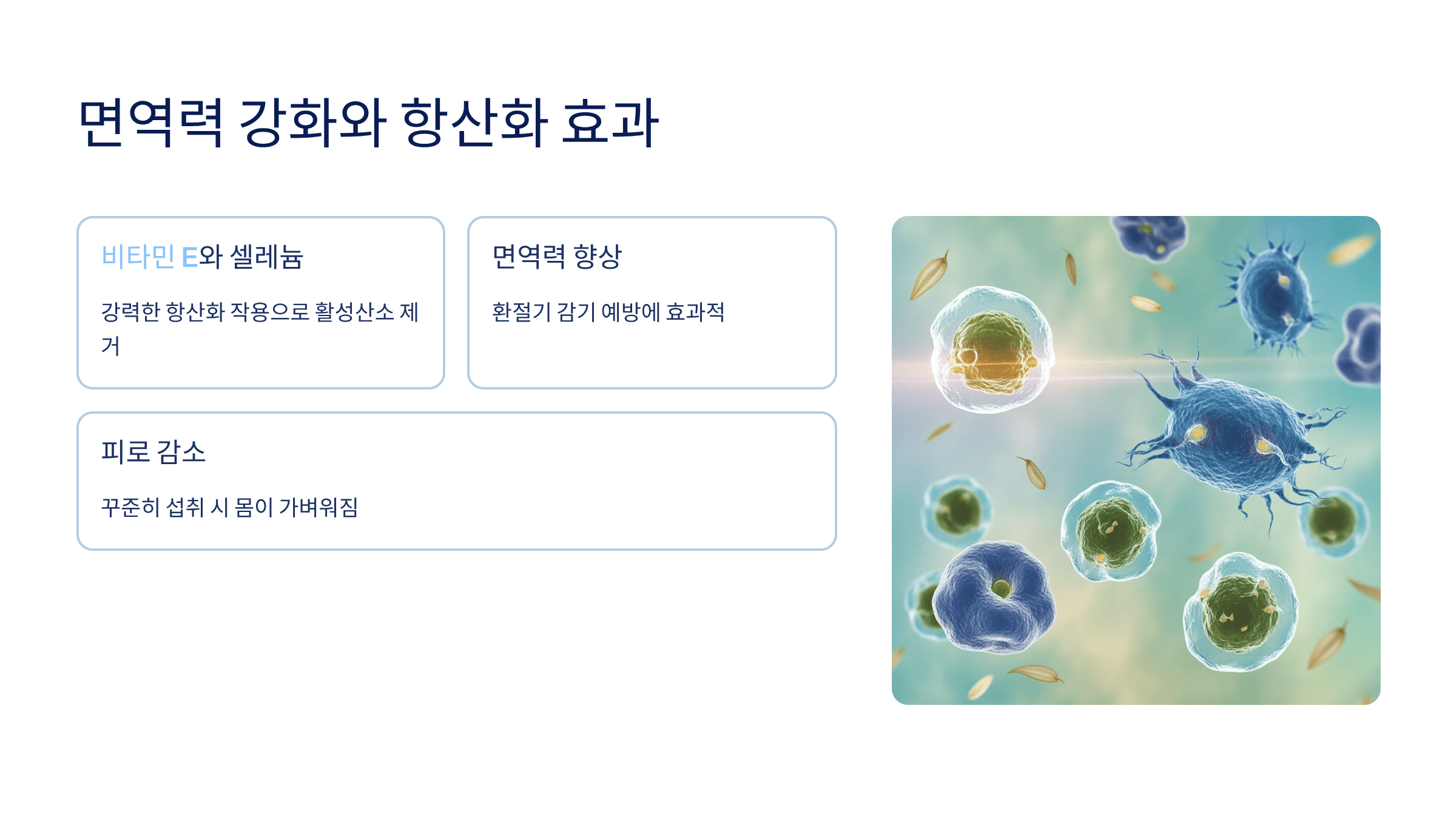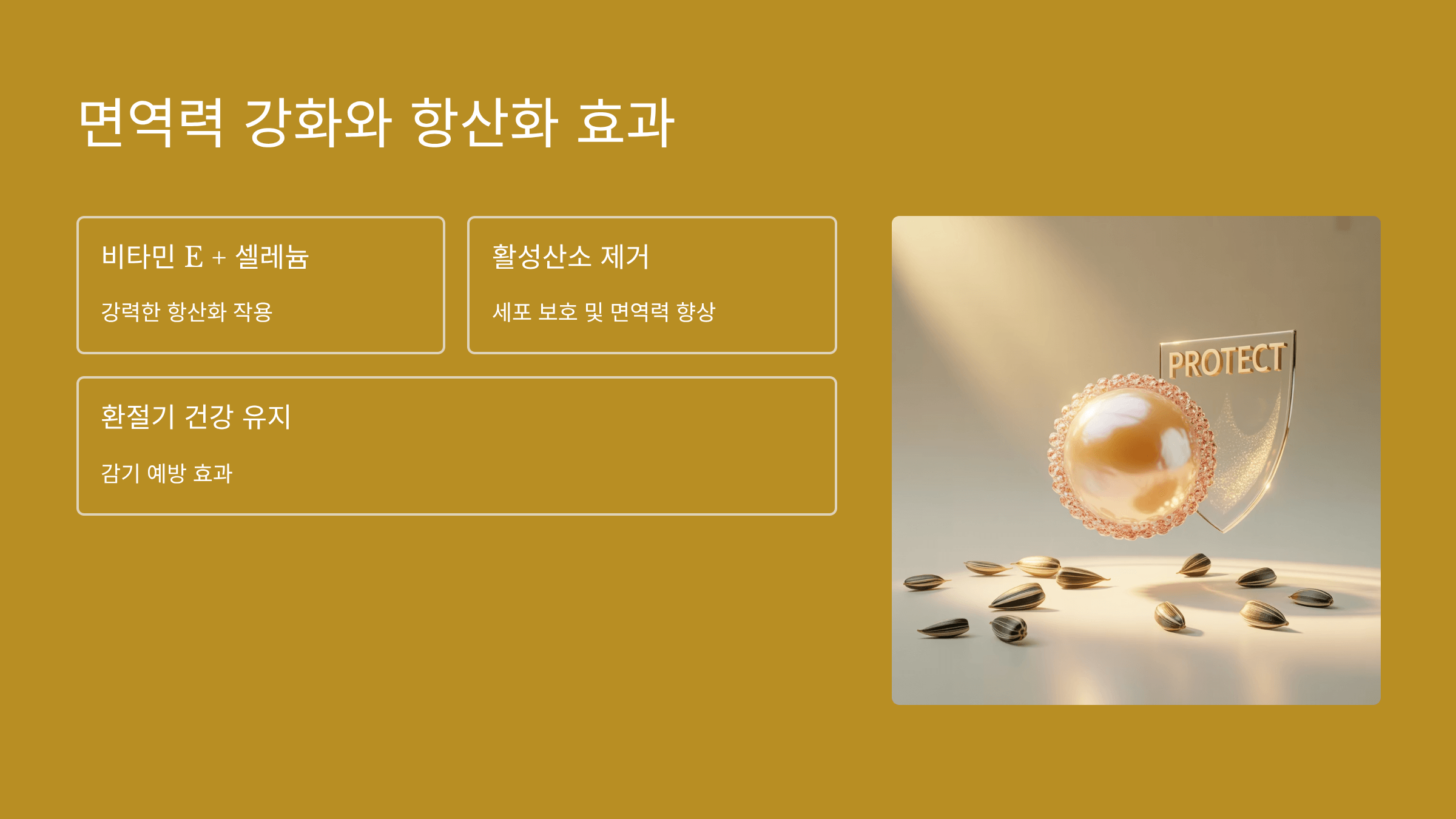 비타민 E와 셀레늄이 풍부한 해바라기씨는 강력한 항산화 작용을 합니다. 이는 활성산소로부터 세포를 보호해 면역력을 높여주고, 감기 같은 잔병치레 예방에도 효과적이에요. 저도 환절기마다 면역력이 약했는데, 해바라기씨를 꾸준히 먹으니 몸이 한결 가벼워지고 피로가 덜 쌓이는 걸 느꼈어요. 💪